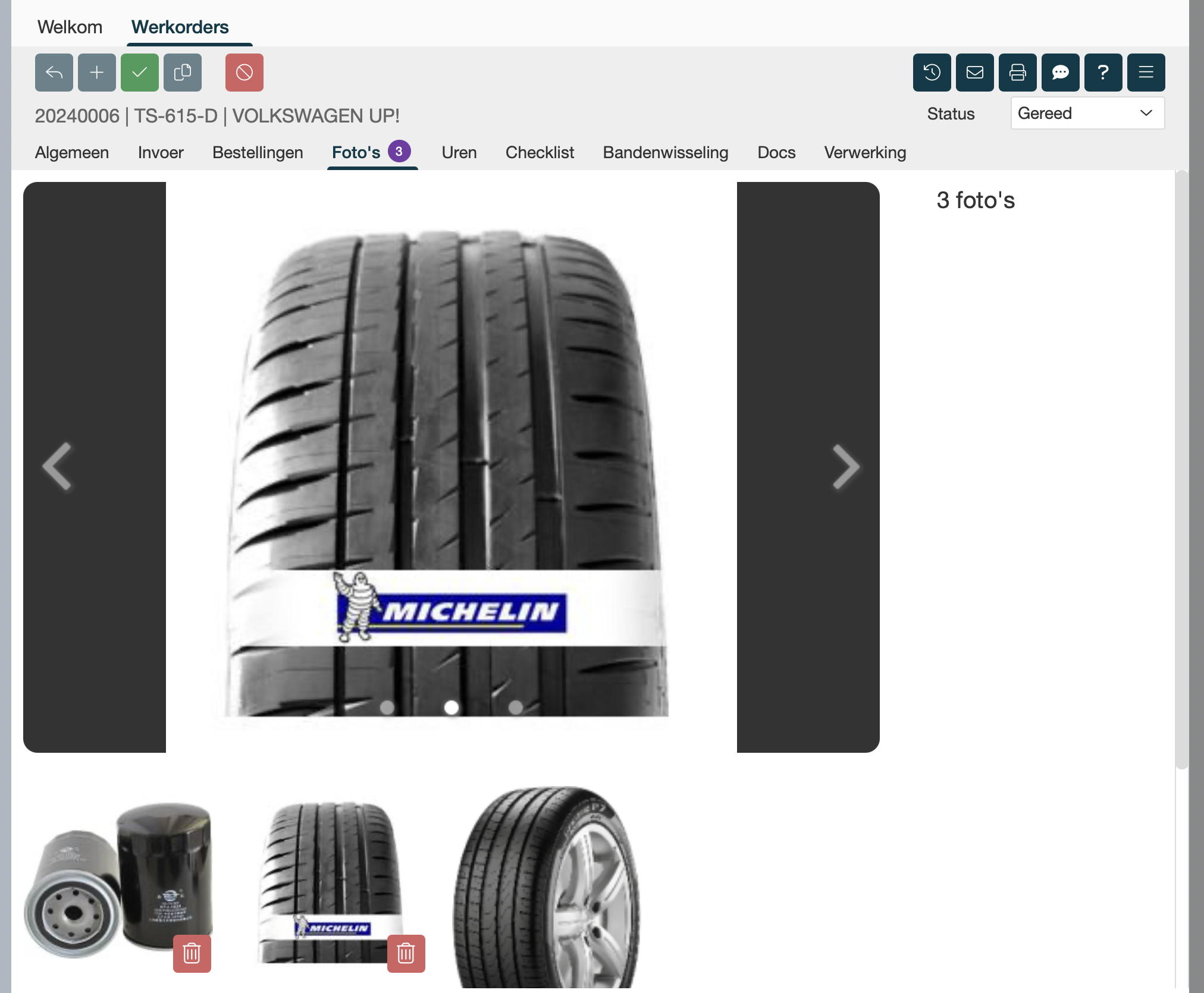 Een overzicht van de toegevoegde foto’s in de werkorder. De foto toevoegen kan bij de order regel, 2e tab |