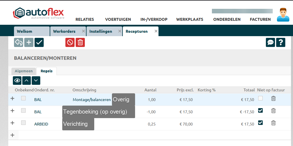 Wil je de kosten van meerdere regels samenvoegen onder één regel voor de klant? Maak dan verborgen regels die je tegen elkaar wegstreept. In het volgende voorbeeld zie je een receptuur voor 'Balanceren en monteren' waarbij de regel 'Montage/balanceren' is gecategoriseerd als 'overige' met de omzetgroep 'overig'. Doe hetzelfde voor de tegenboeking. Voor de regel 'Arbeid' kies je het type 'Verrichting' met de juiste omzetgroep.