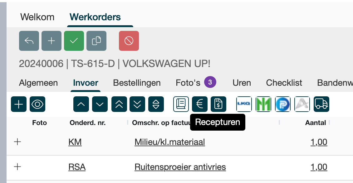 Binnen de werkorders vind je onder invoer het knopje recepturen.