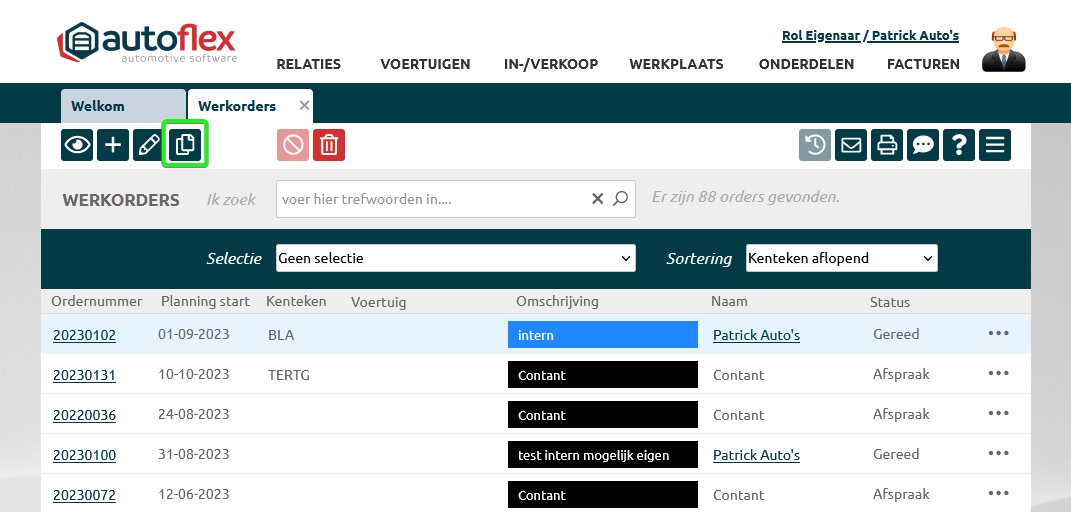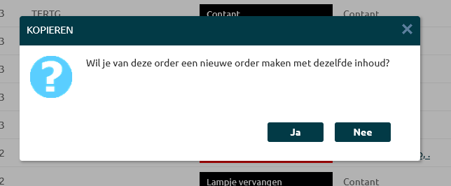 Boven de werkorderlijst en bovenin het werkorder-detailscherm bevindt zich een kopieerknop waarmee je de geselecteerde order kan kopiëren.