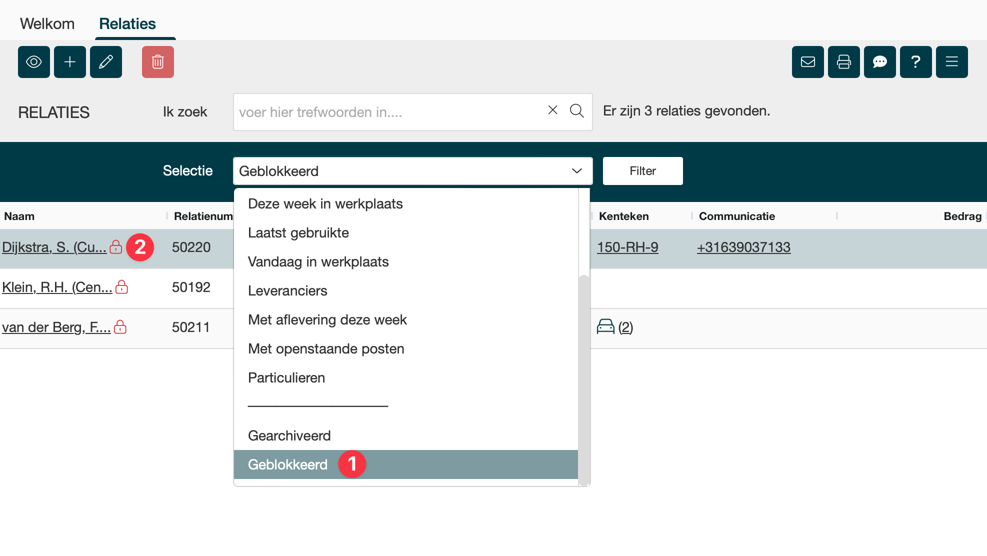 Blokkeren betekent dat de klant nog wel in het systeem staat, maar dat je er niets nieuws meer mee kunt doen. Je kunt bijvoorbeeld geen nieuwe werkorder, factuur of afspraak aanmaken. Handig als je nog wel een stukje historie nodig hebt, maar verder geen actie meer wilt ondernemen.