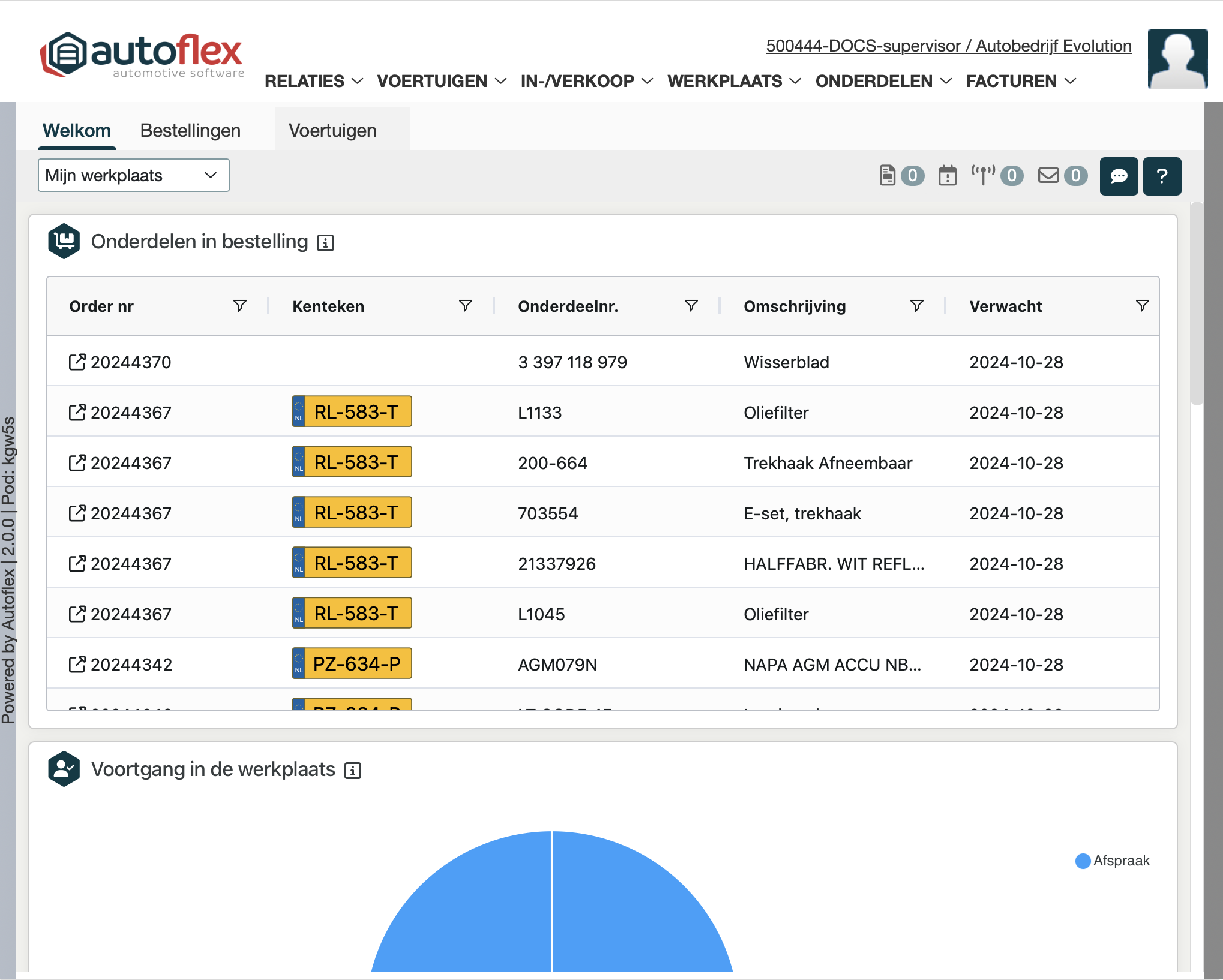 Je ziet de werkorders per afzonderlijke status. In het taartdiagram geven de kleuren de status aan. Klik op een gekleurd vlak om rechts de orders met die status te zien. |