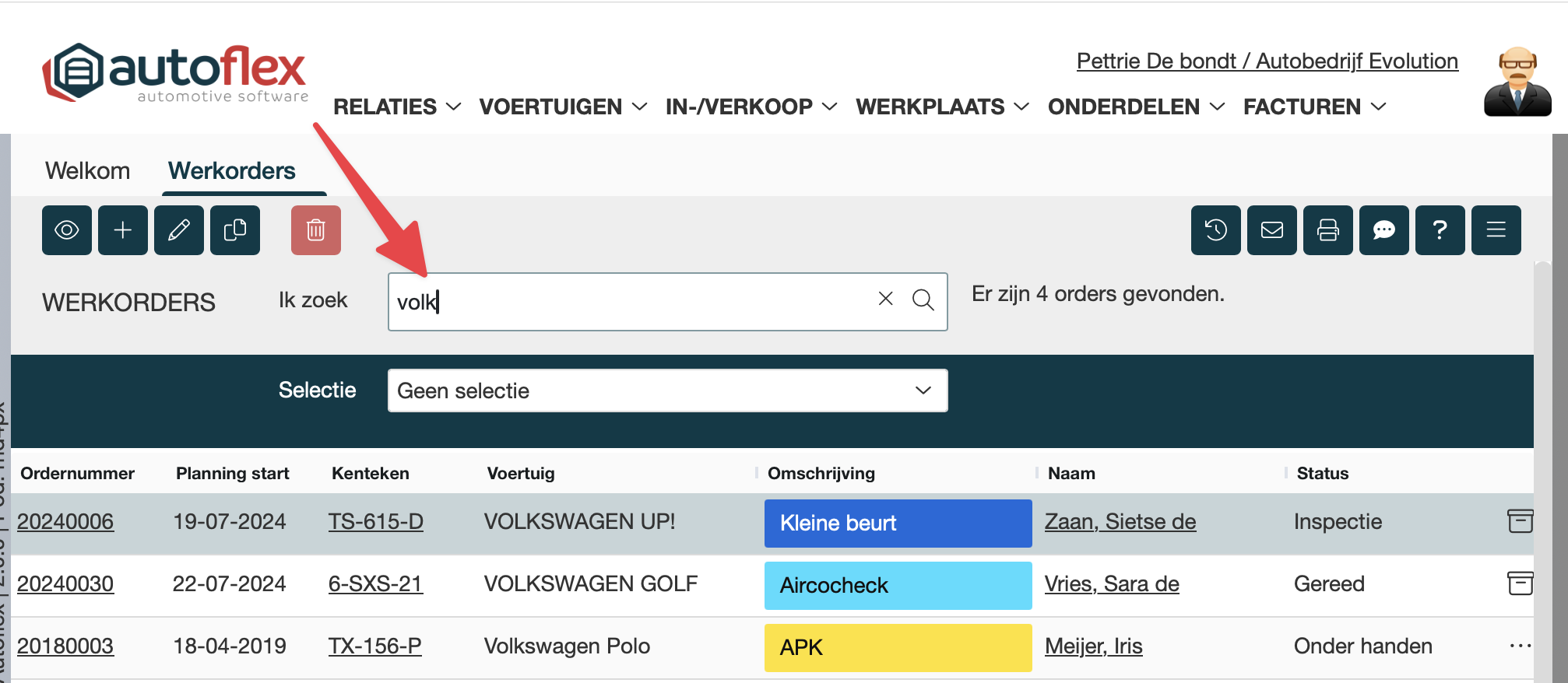 Handig is dat je niet hoeft te weten waar de informatie precies staat. Zoek je op kenteken? Dan krijg je het voertuig en de gekoppelde klant te zien. Zoek je op naam? Dan verschijnen direct de juiste relaties.