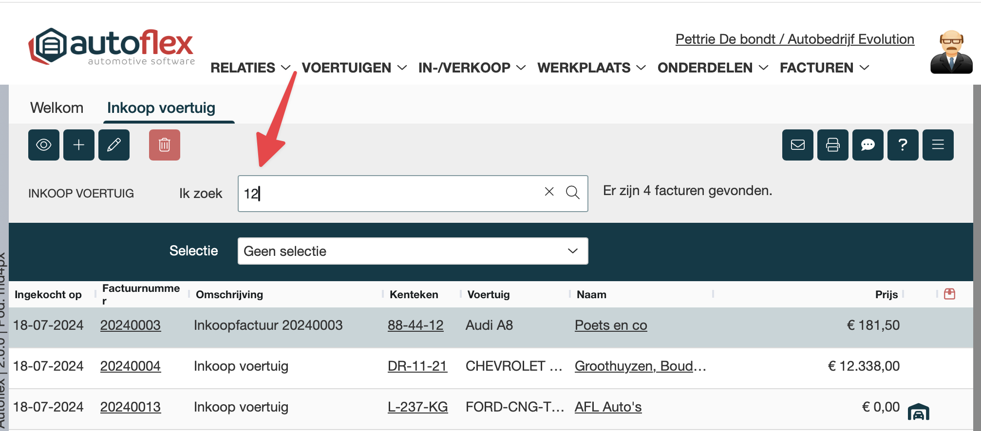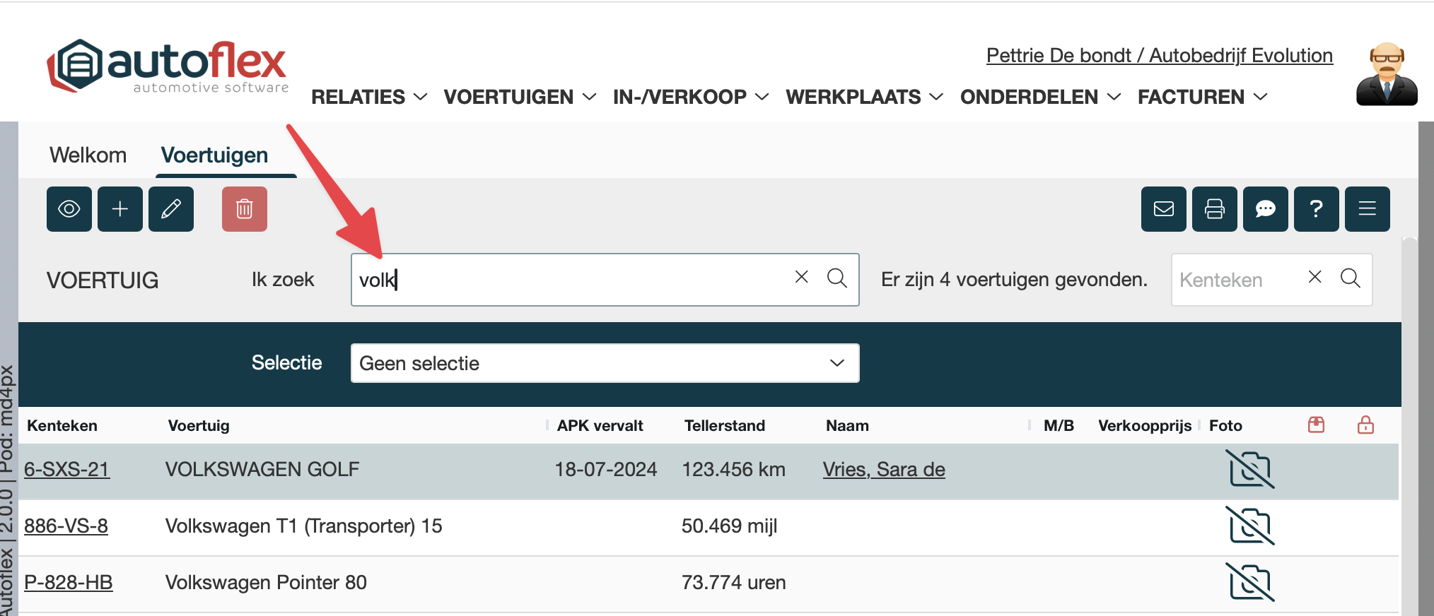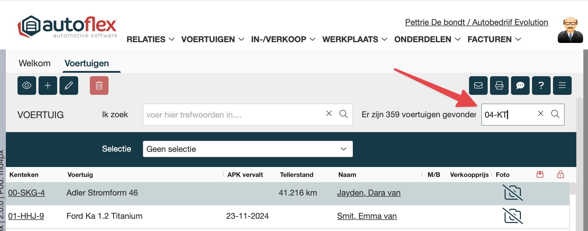 Handig is dat je niet hoeft te weten waar de informatie precies staat. Zoek je op kenteken? Dan krijg je het voertuig en de gekoppelde klant te zien. Zoek je op naam? Dan verschijnen direct de juiste relaties.