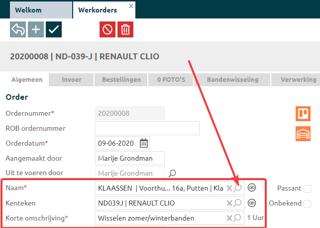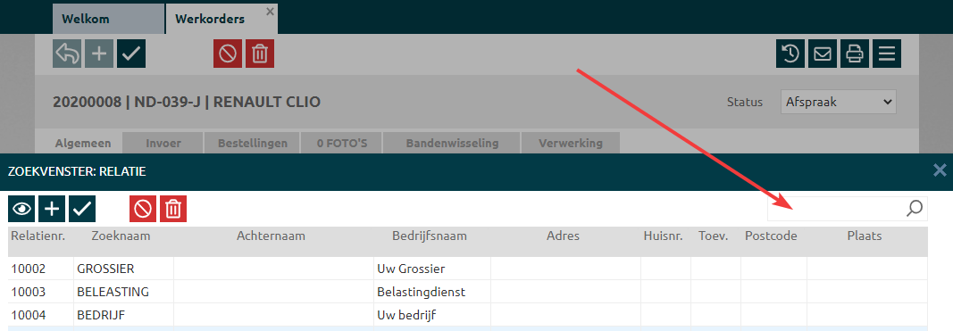Diverse zoekvensters zijn op te roepen vanuit de werkorder. Binnen deze zoekvensters kun je makkelijk de juiste gegevens terugvinden. |