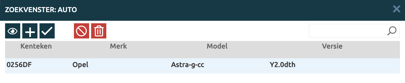 In dit zoekvenster kun je zoeken op Kenteken, Merk, Model en Versie. |