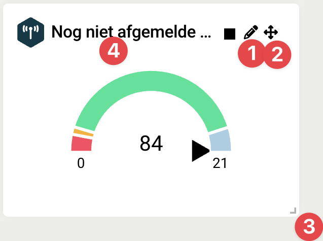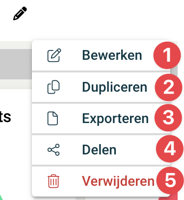 Bewerken, bewerk het huidige dashboard Dupliceren, maak een kopie van het huidige dashboard Exporteren, exporteer het dashboard naar PDF Delen, deel het dashboard met 1 of meerdere medewerkers Verwijderen, verwijder het huidige dashboard