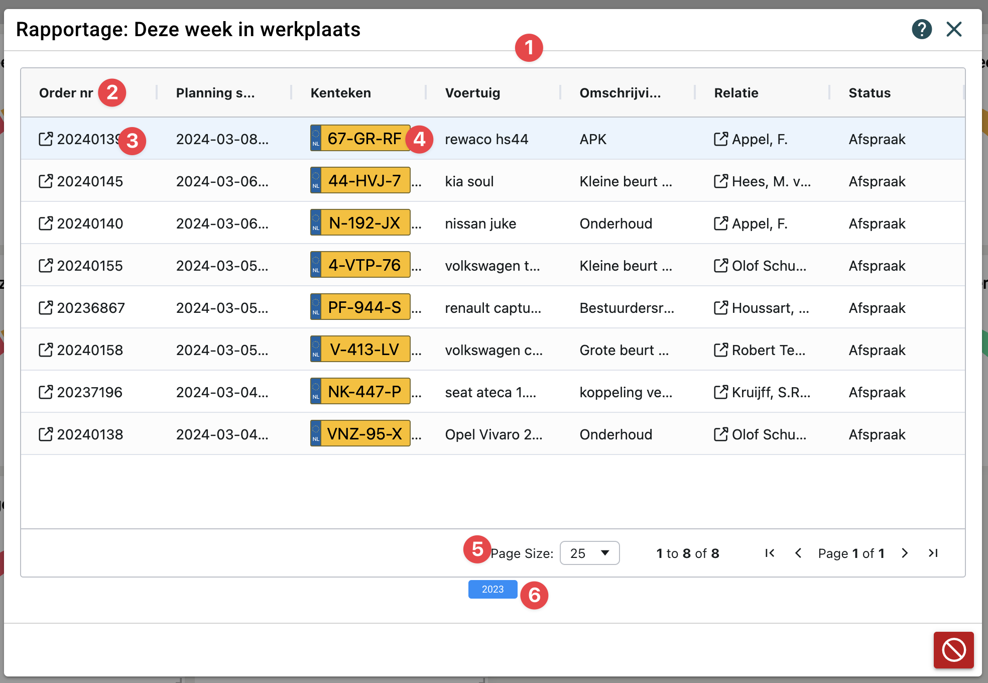Kenteken, kenteken data, klik direct door naar het voertuig Navigatie binnen de tabel om meer data te tonen Keuze van de periodeselectie, om de data te zien dan deze periode, zie ook: Periodeselector