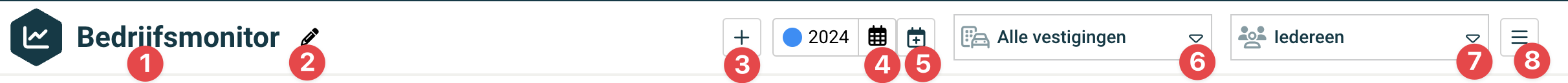 De onderdelen van het bedrijfsmonitor scherm Hoofdmenu balk > Profiel en documentatie Menu balk > Dashboard naam + selector, Tijdsperiode selector, vestiging*, personeelslid Sectie > onderverdeling van het huidige dashboard Grafiek > Grafiek binnen het dashboard