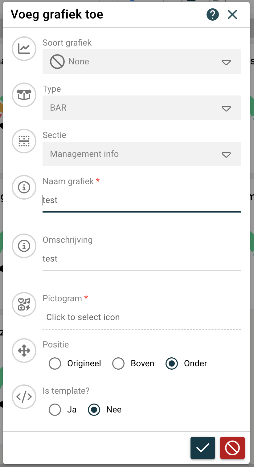 Soort grafiek, keuze van de voorgedefinieerde lijst Type Sectie, binnen welke sectie zit de grafiek Naam Omschrijving Icoon Positie binnen de sectie Template