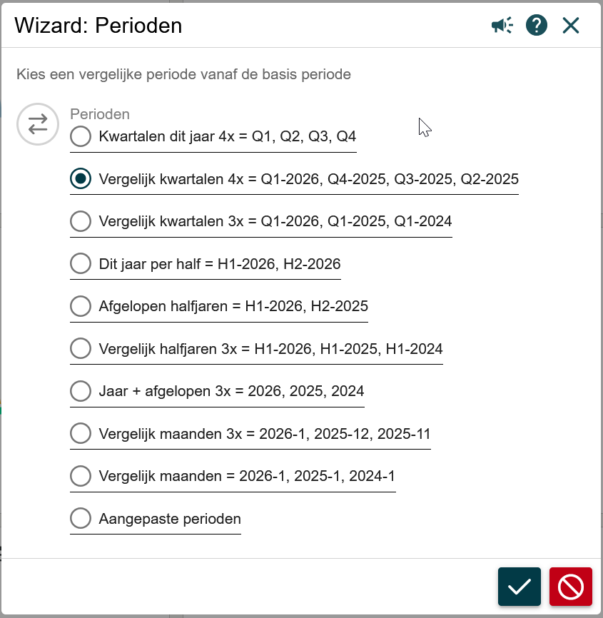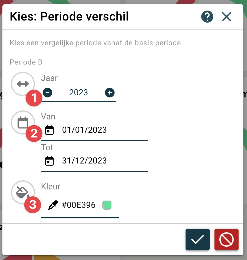 Kies de juiste range De range hangt af van de periode die geselecteerd is bij de eerste periodeselector Als deze Kwartaal is dan zal de 2e periode ook een kwartaal zijn Controleer het datum bereik Kies een kleur voor deze periode Als het een bestaande periode is kun je die hier ook weer verwijderen