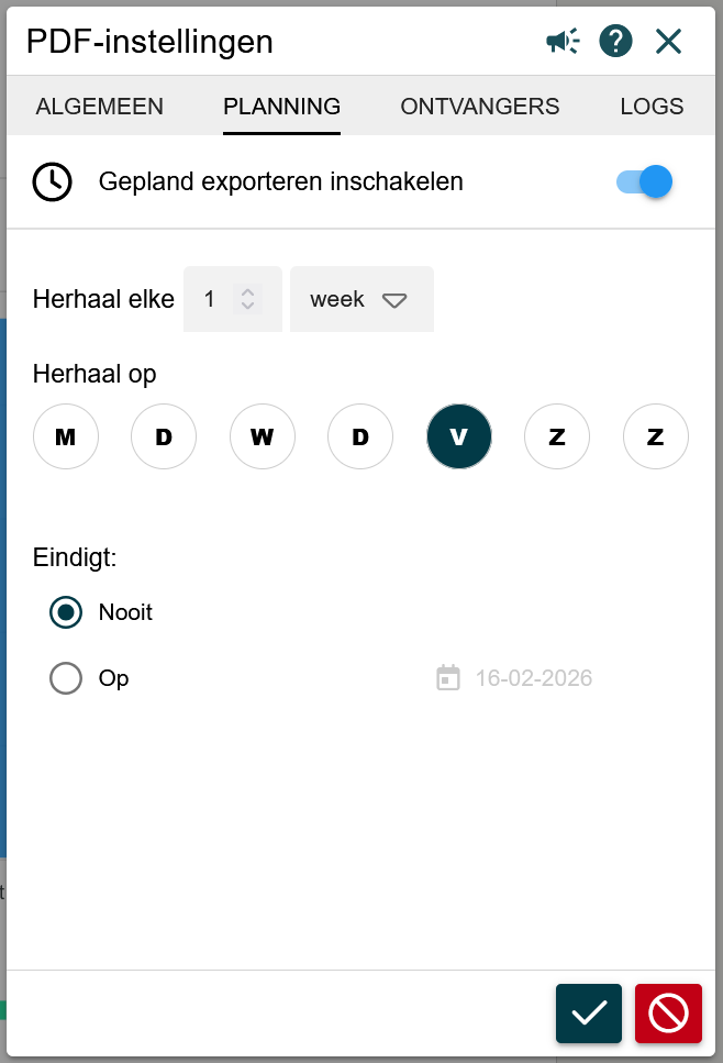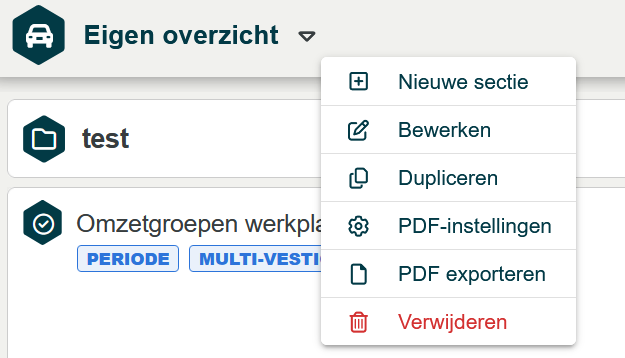 Nieuwe sectie, maak hiermee een nieuwe sectie aan Bewerken, bewerk het huidige dashboard Dupliceren, maak een kopie van het huidige dashboard PDF-instellingen, maak hiermee een geplande pdf export van de dashboard, om bijvoorbeeld wekelijks een mail te ontvangen met de pdf export van de betreffende dashboard.  Exporteren, exporteer het dashboard naar PDF Verwijderen, verwijder het huidige dashboard