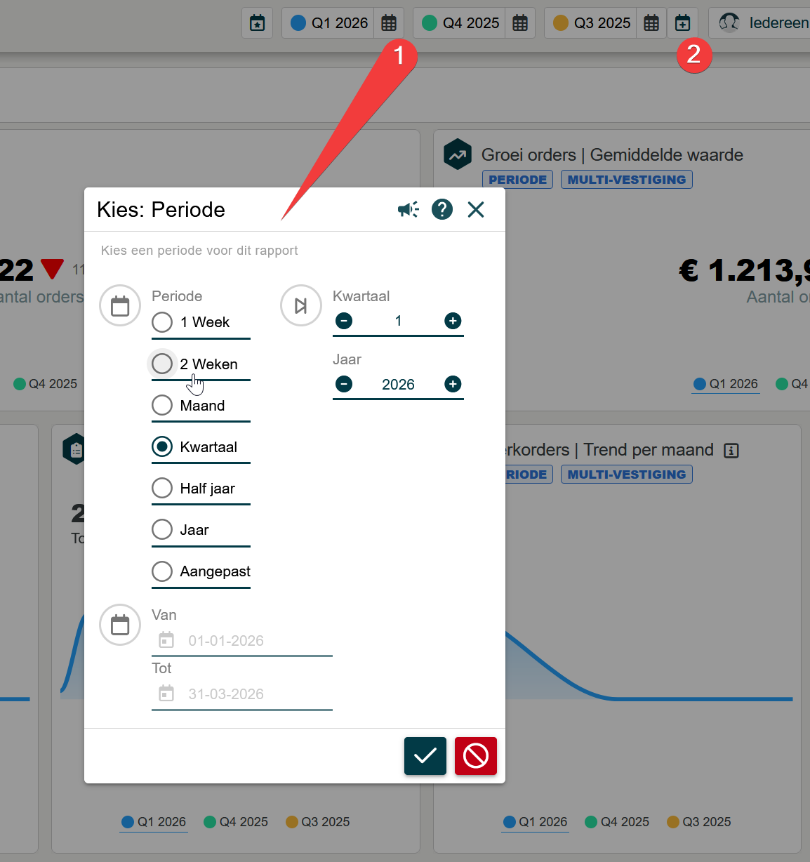 klik op de agenda pictogram om de periode in te stellen of aan te passen
