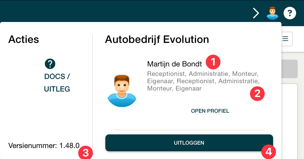 Profiel informatie, met: Gebruikers informatie Rollen Versie nummer Uitloggen