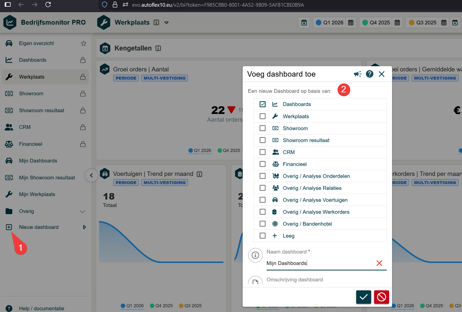 Klik op de onderste knop 'Nieuw dashboard' om een nieuwe dashboard toe te voegen