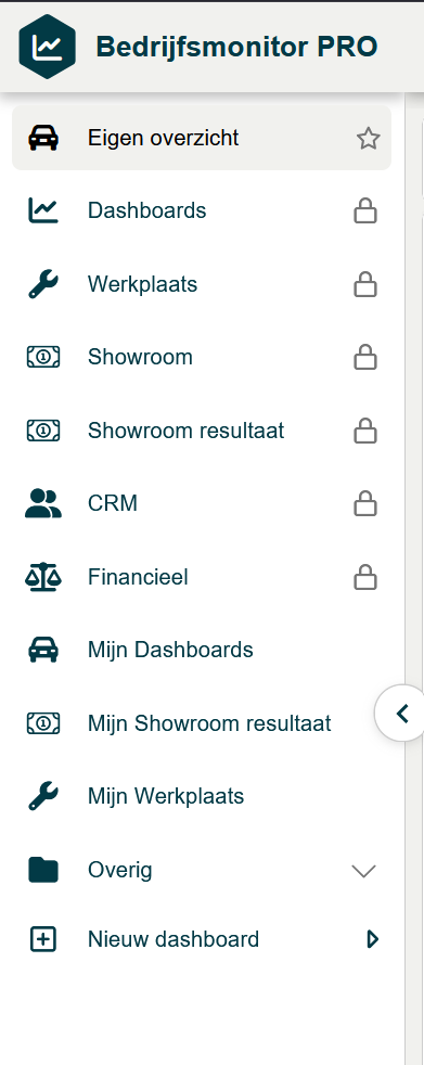 Als je de bedrijfsmonitor PRO opent dan zie je aan de linkerkant het menu voor de dashboards |