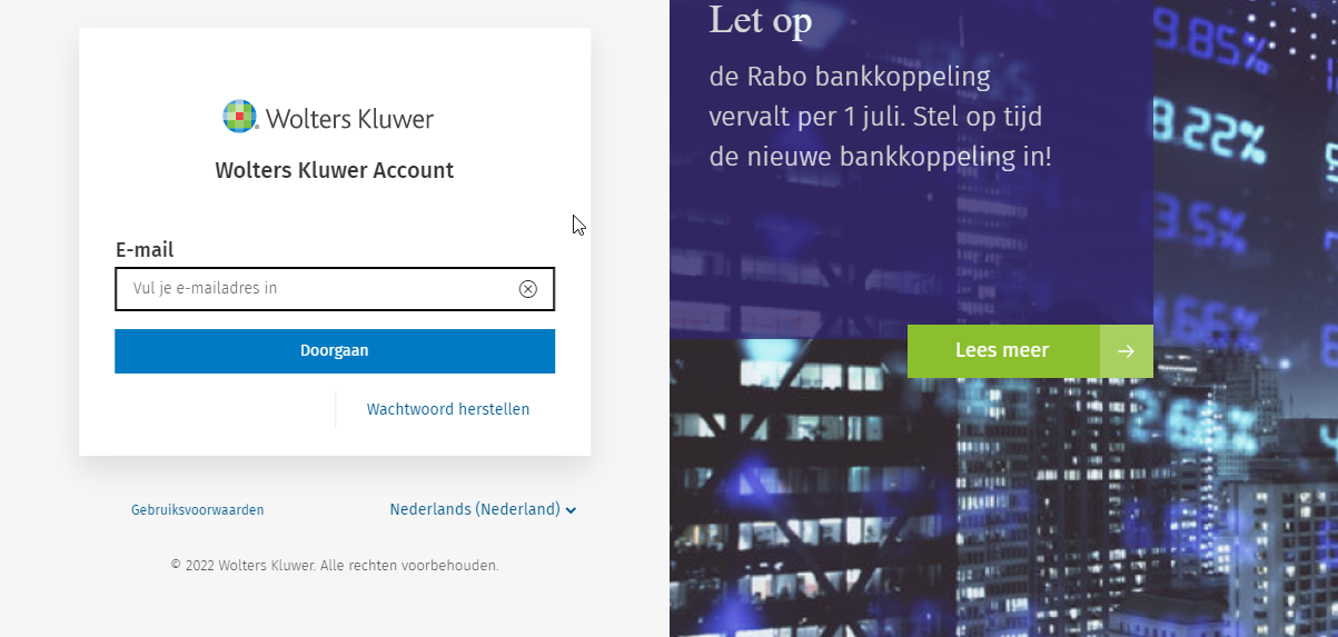 Klik vervolgens op de knop 'Authenticatie'. Je krijgt nu het inlogscherm van Twinfield te zien. Klik hier op 'Login met Wolters Kluwer Account'. |