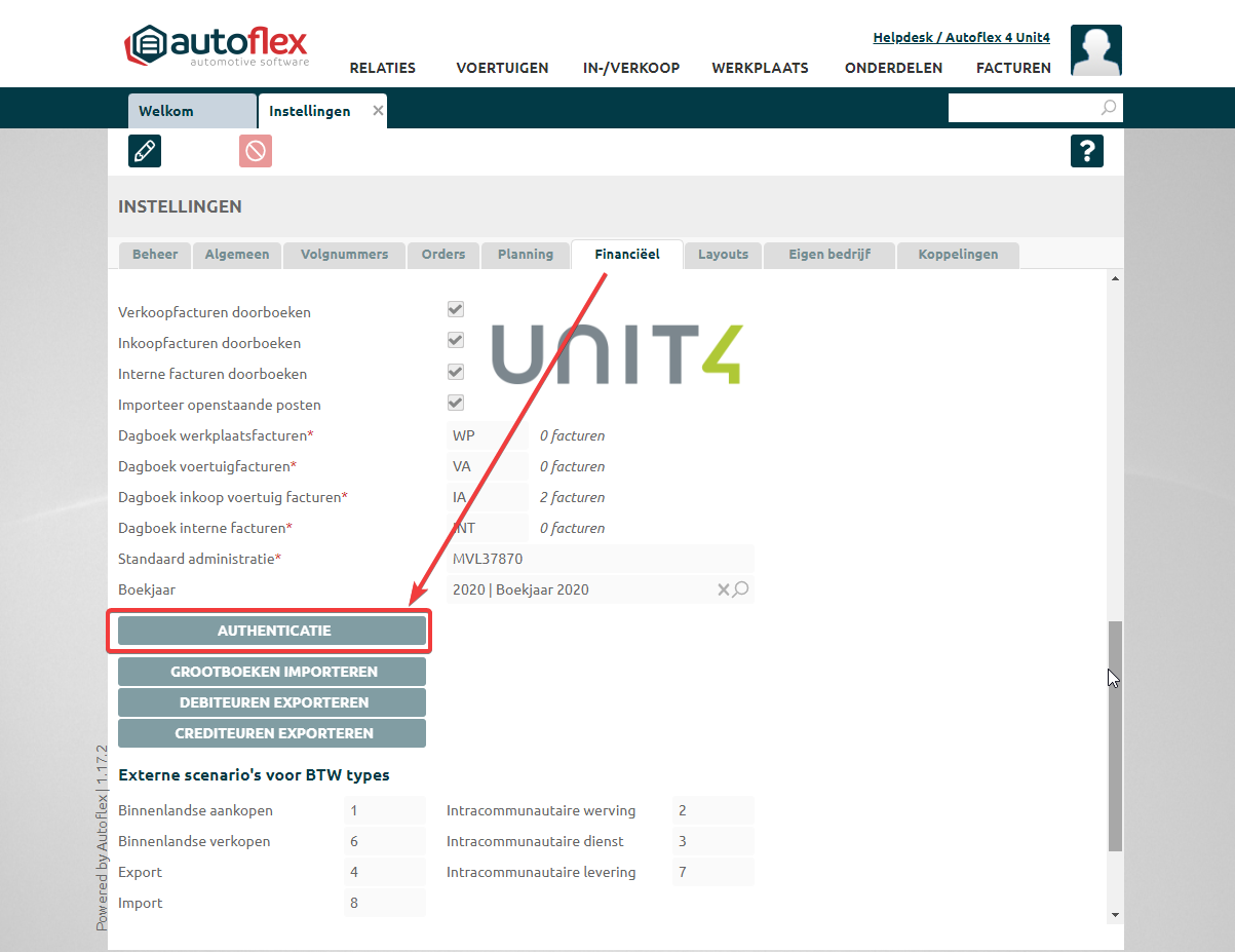 Tijdens de installatie van Autoflex is de koppeling met Unit4 gemaakt. Voor het maken van de koppeling met Unit4 moet er geauthentiseerd worden. Als dit opnieuw gedaan moet worden moeten onderstaande stappen worden uitgevoerd: