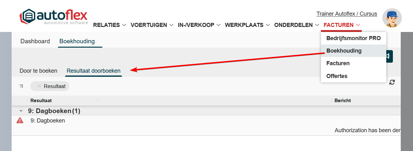 • Dan moet je eerst in de boekhouding controleren of de factuur hetzelfde is als in Autoflex. Verander hierna de boekstatus van Door te boeken naar Doorgeboekt.