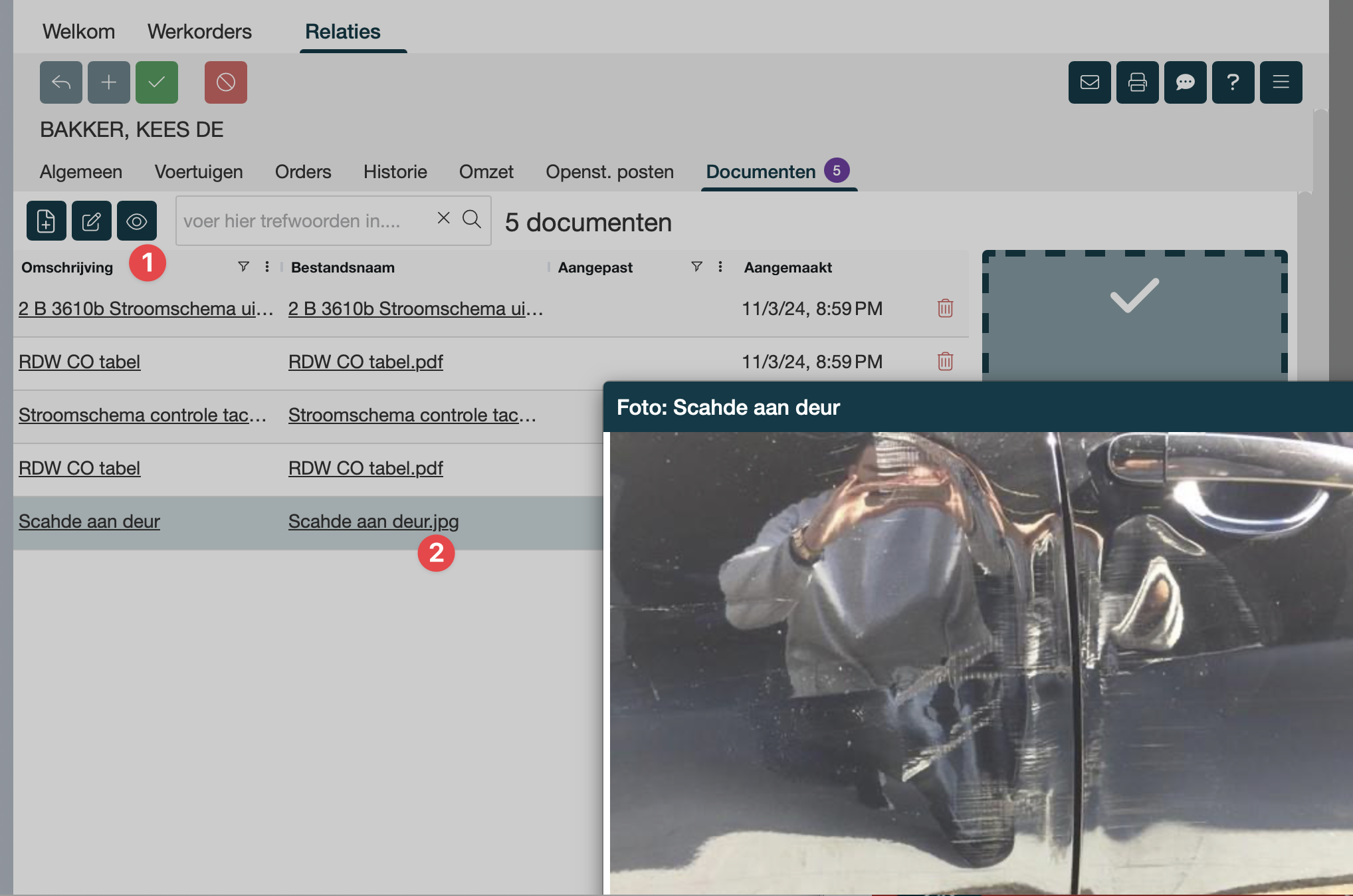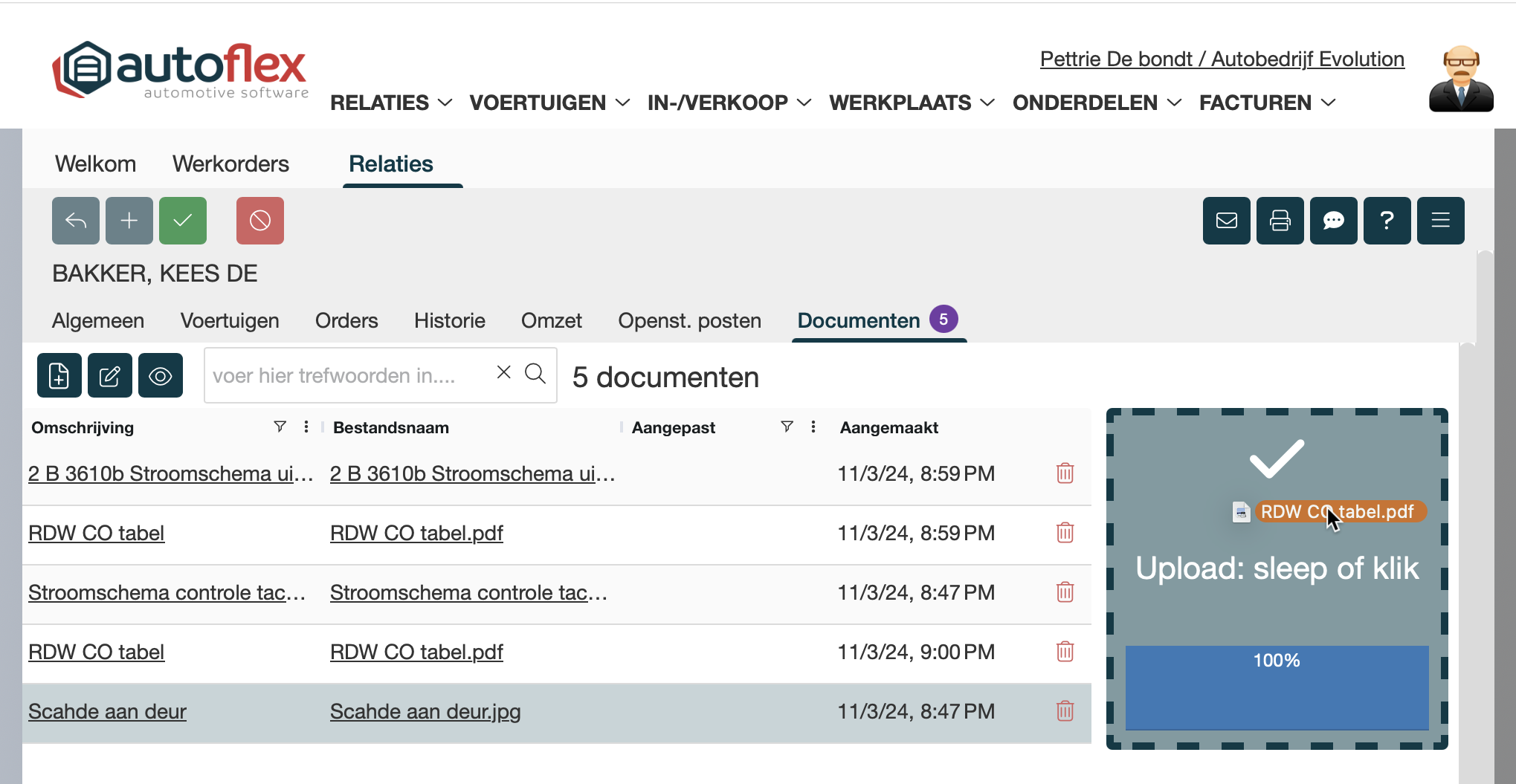 Met de module Document beheer kun je op bijna alle plaatsen in Autoflex documenten toevoegen, wijzigen en verwijderen. Zo kun je bij jou relaties informatie bewaren over de relatie zodat alle informatie direct bij de hand is. Ook kan het handig zijn om meetgegevens en bonnetjes direct bij de werkorder te bewaren, dit kan handig met Document beheer.