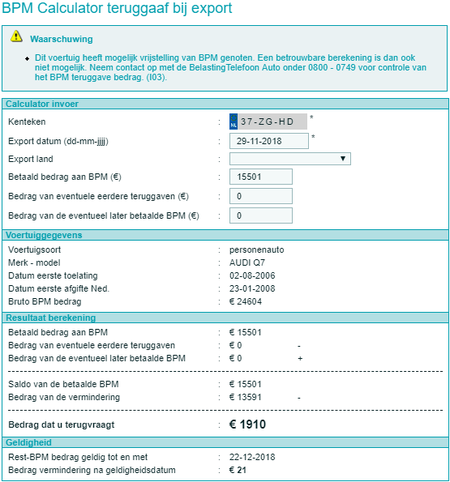 In de melding bij deze berekening zie je dat er geen betrouwbare berekening mogelijk is. Voor het juiste BPM bedrag neem je daarom contact op met de belastingdienst. |