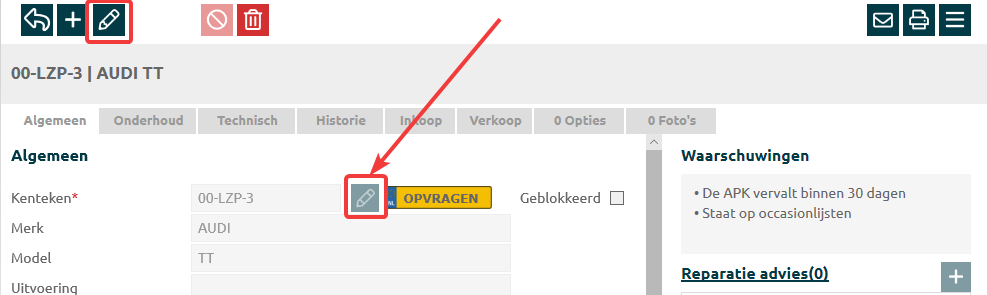 Bij inkoop van de BPM is meestal ook het nieuwe kenteken bekend. Klik in de inkoop helemaal rechts op het kenteken, en vervolgens op Wijzigen om het kenteken te kunnen aanpassen. |