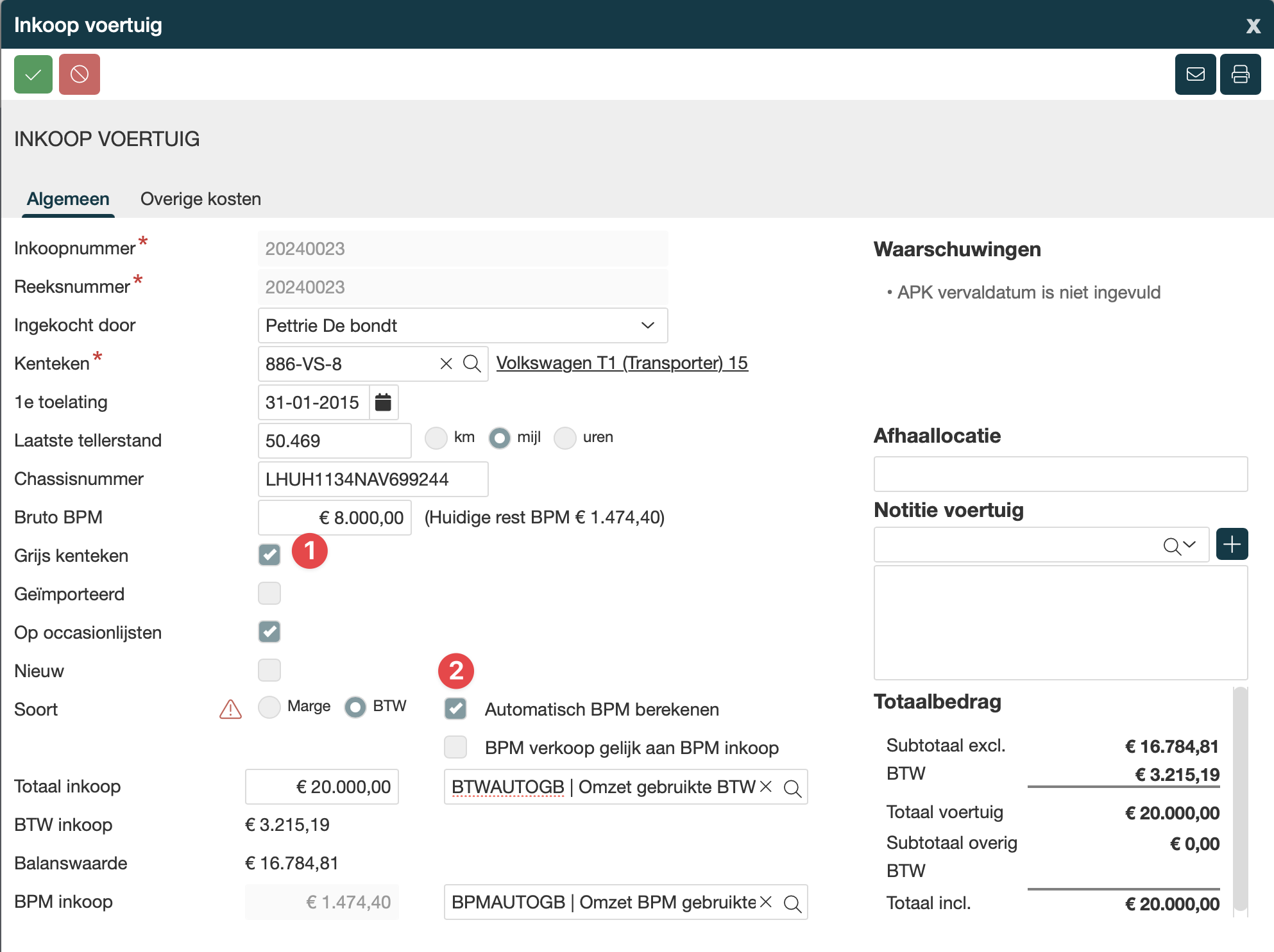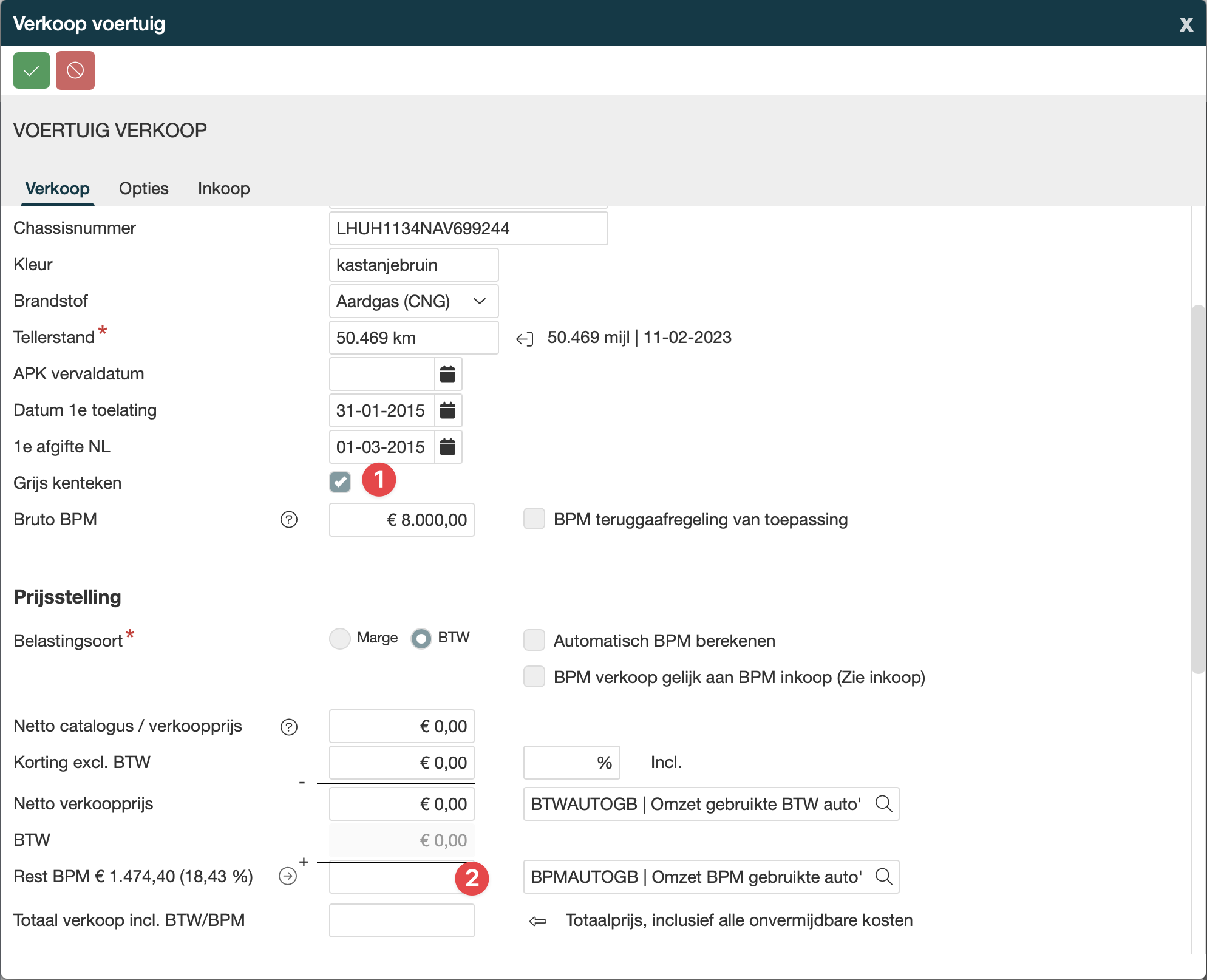 Wanneer je een grijs kenteken gaat verkopen wordt het vinkje grijs kenteken automatisch al aangezet en wordt het BPM bedrag automatisch al leeg gehaald. |