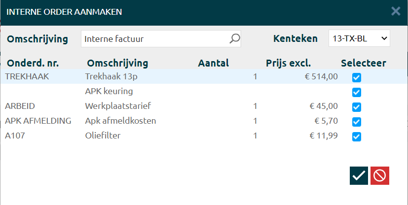 Daarna volgt het scherm hieronder, selecteer welke onderdelen en/of werkzaamheden je over wil nemen naar een interne werkorder.