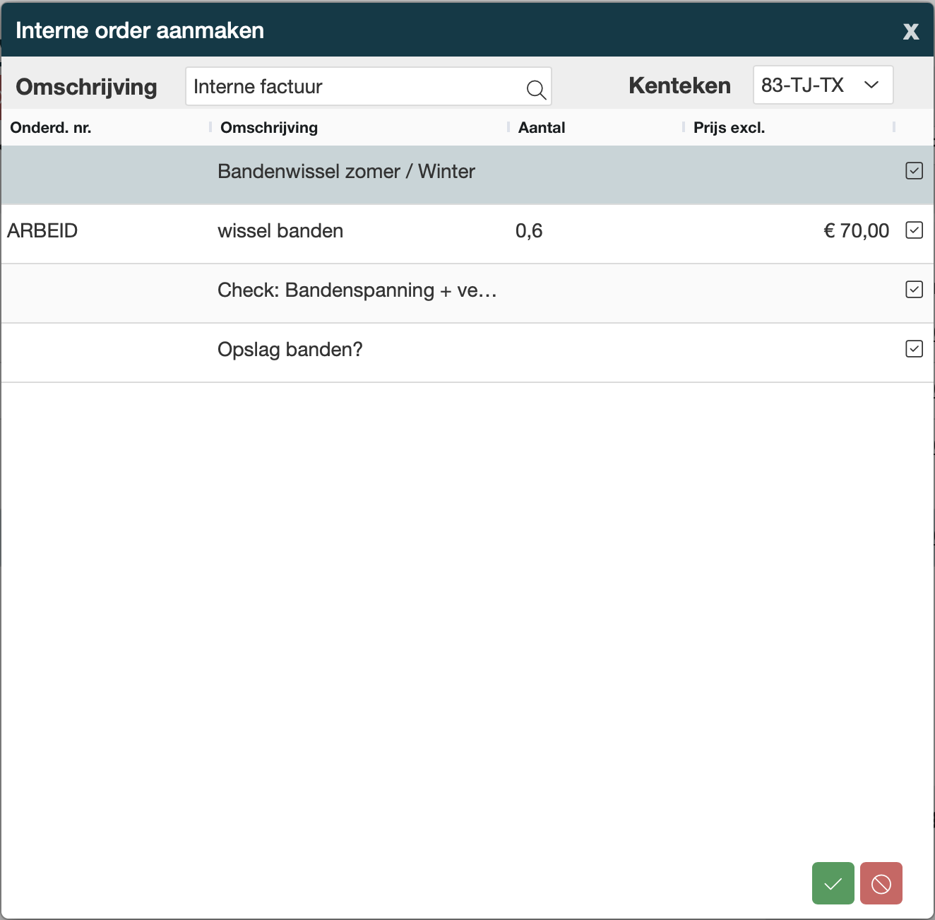 Daarna volgt het scherm hieronder, selecteer welke onderdelen en/of werkzaamheden je over wil nemen naar een interne werkorder. En klik op het vinkje