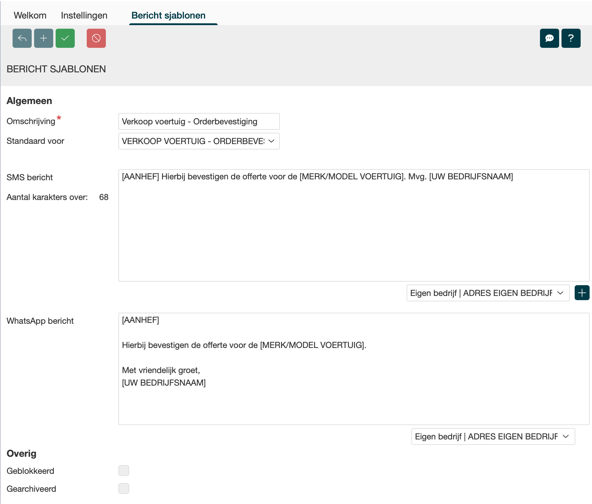 Bericht sjablonen (WhatsApp en SMS)