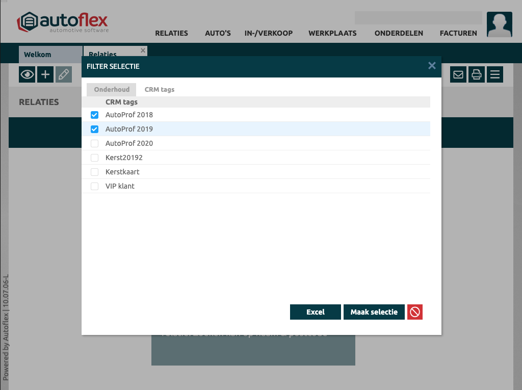 In het overzicht van relaties kun je filteren op 1 of meerdere CRM tags (2e tabblad in filterdialoog). Er is nu de mogelijkheid de selectie in het relatie overzicht te tonen en daarop een nieuwe (sub)selectie te doen en gegevens in te zien. Ook is er de mogelijkheid het resultaat meteen naar Excel te exporteren dmv. de Excel knop |