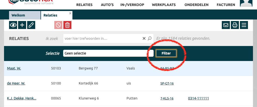 De filter knop filtert relaties op de reeds bestaande lijst in het overzicht. Wil je filteren op alle relaties, zorg dan dat je geen selecties hebt gemaakt en het zoekveld leeg is.