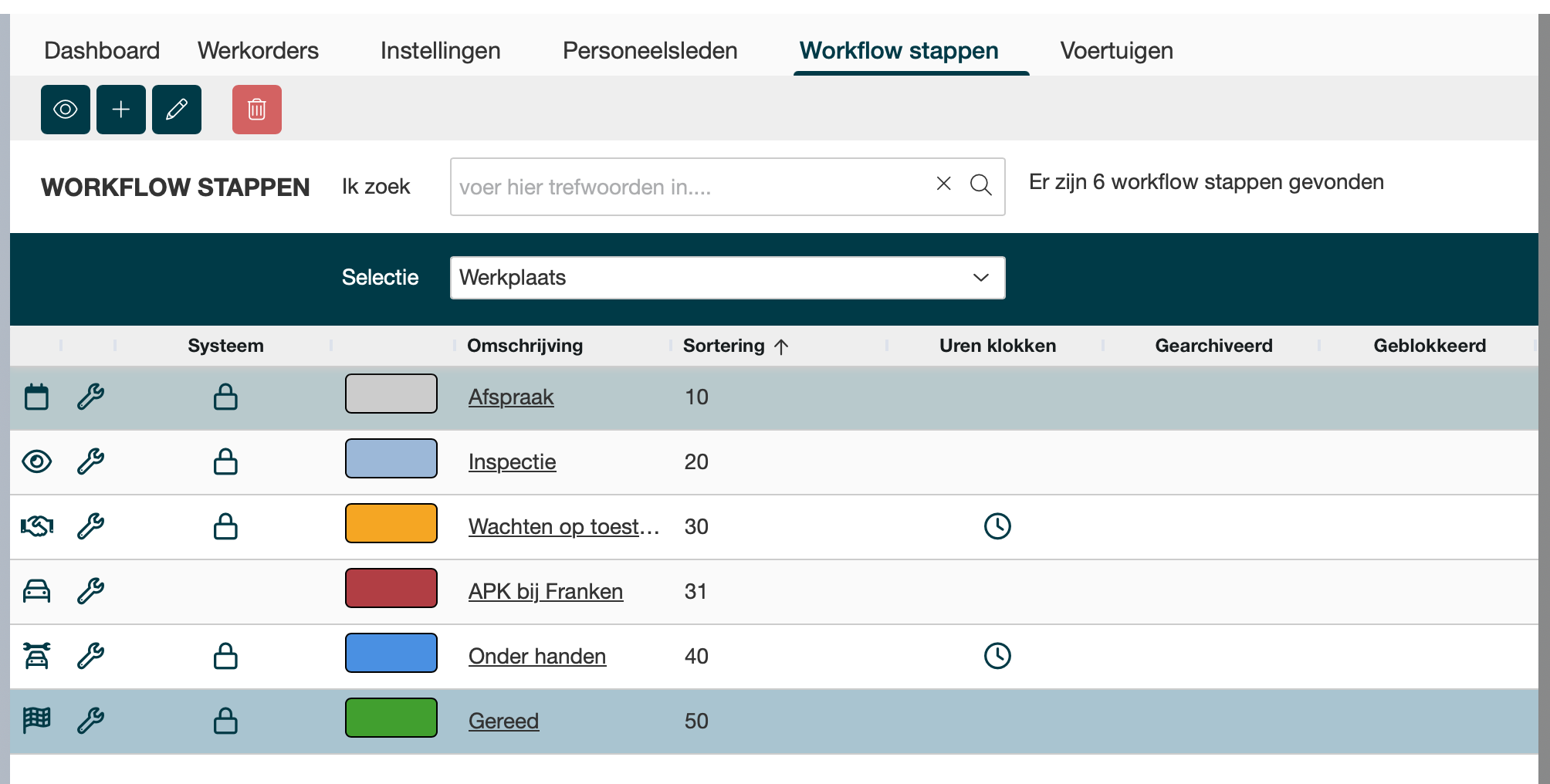 Scherm werkorder stappen gesorteerd op sortering, binnen Werkplaats of Verkoop voertuig |