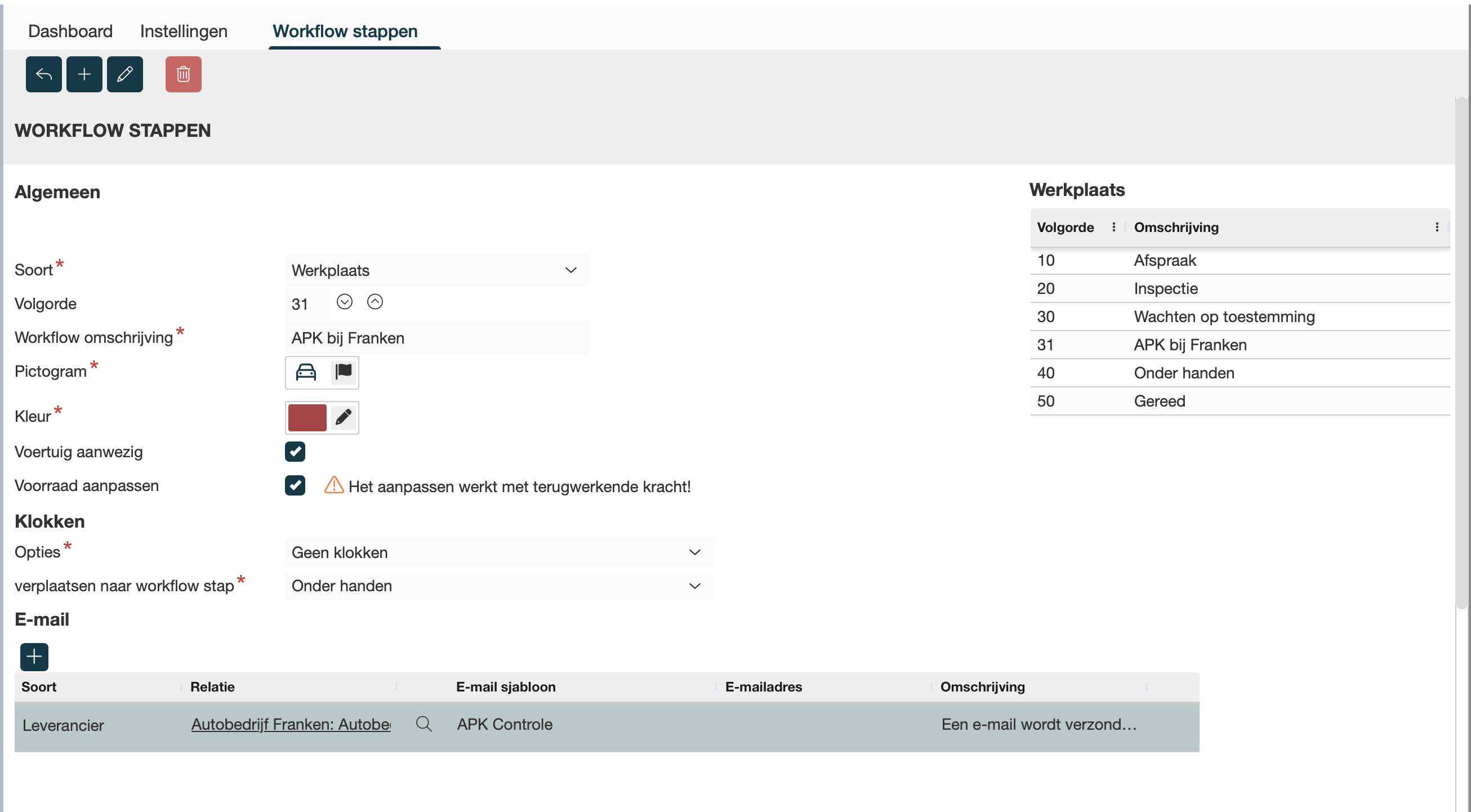 Verplaats naar workflow stap, dit veld is alleen zichtbaar als de Optie NIET ‘Monteur mag klokken op deze status’
