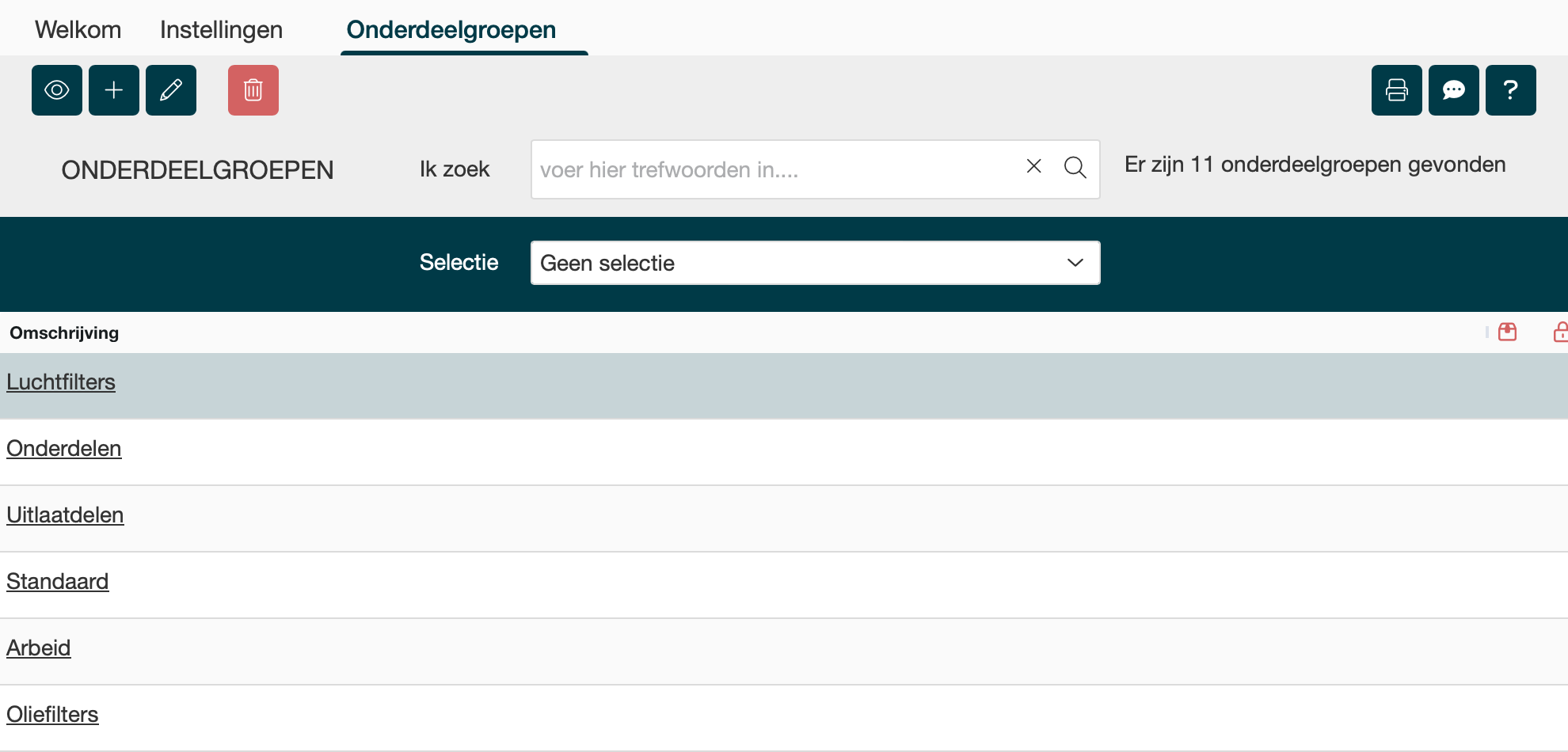 Onderdeelgroep lijst scherm |