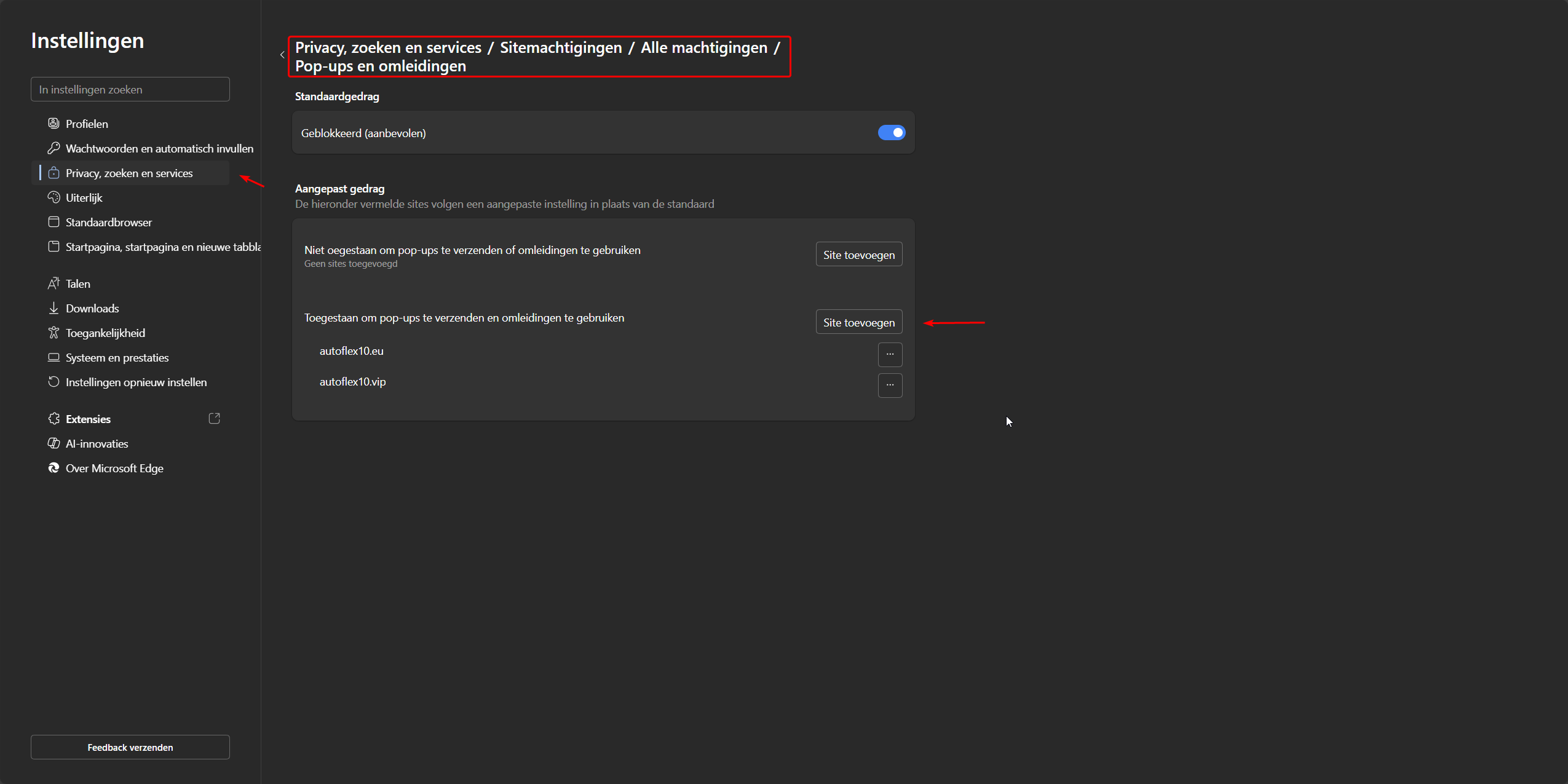 Rechts bovenin de drie puntjes (Menu) → Privacy, zoeken en services → sitemachtigingen → alle machtigingen → pop-ups en omleidingen Je kunt ook deze onderstaande link kopiëren en plakken in je browser: |