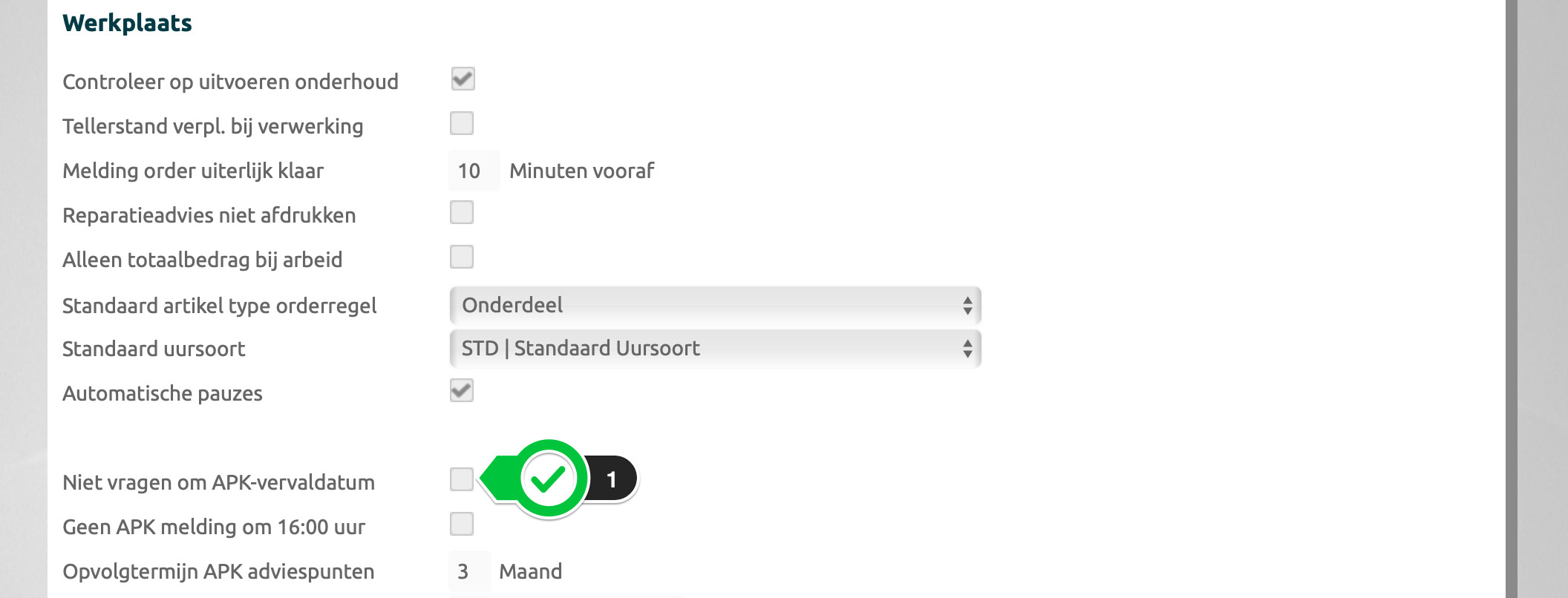 Checkbox, keuze bij het verwerken van een werkorder niet controleren op vervaldatumGeen APK melding om 16:00