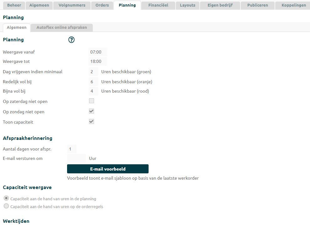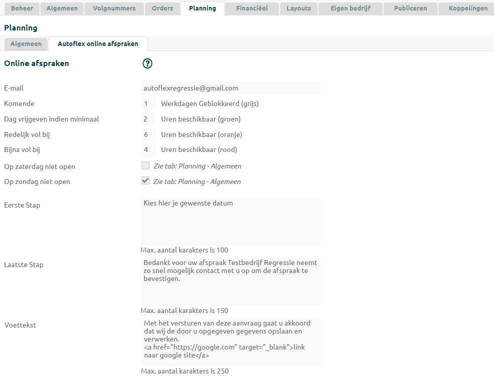 Het email adres dat gebruikt wordt om nieuwe online afspraak te ontvangenKomende ... Werkdagen geblokkeerd (grijs) = aantal dagen
