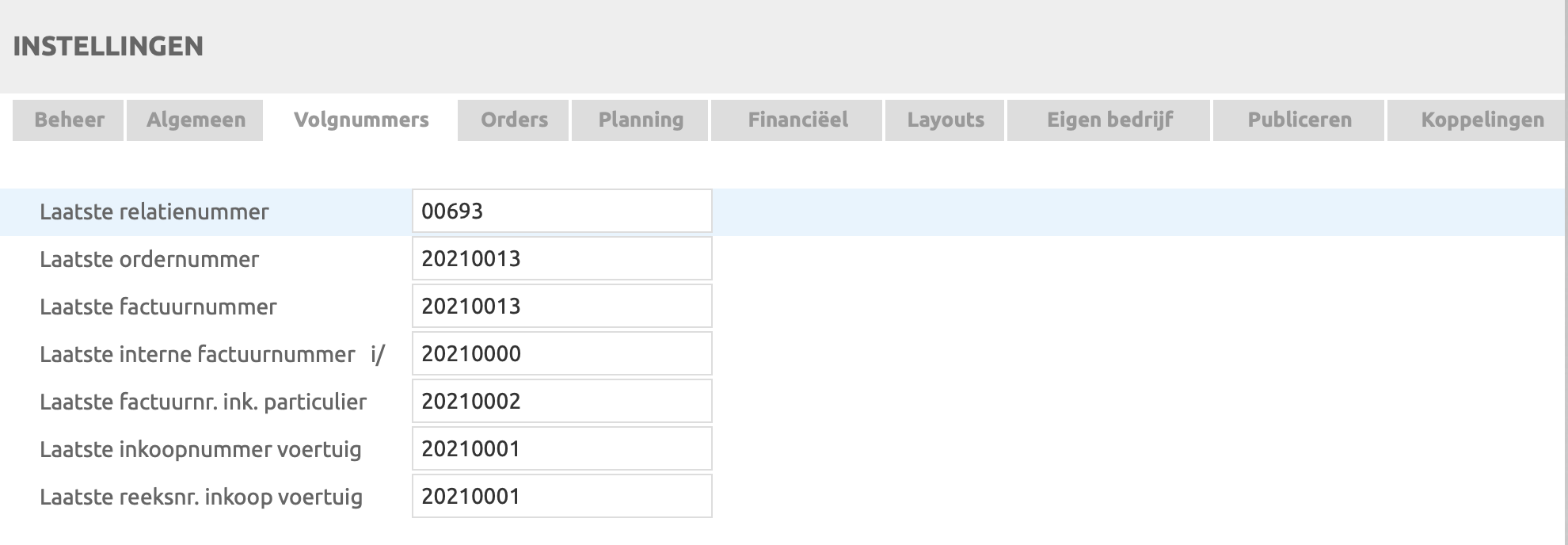 Deze worden altijd voorzien van een i voor internLaatste factuurnr. ink. particulier = nummer voor inkoop facturen voertuig van particulieren