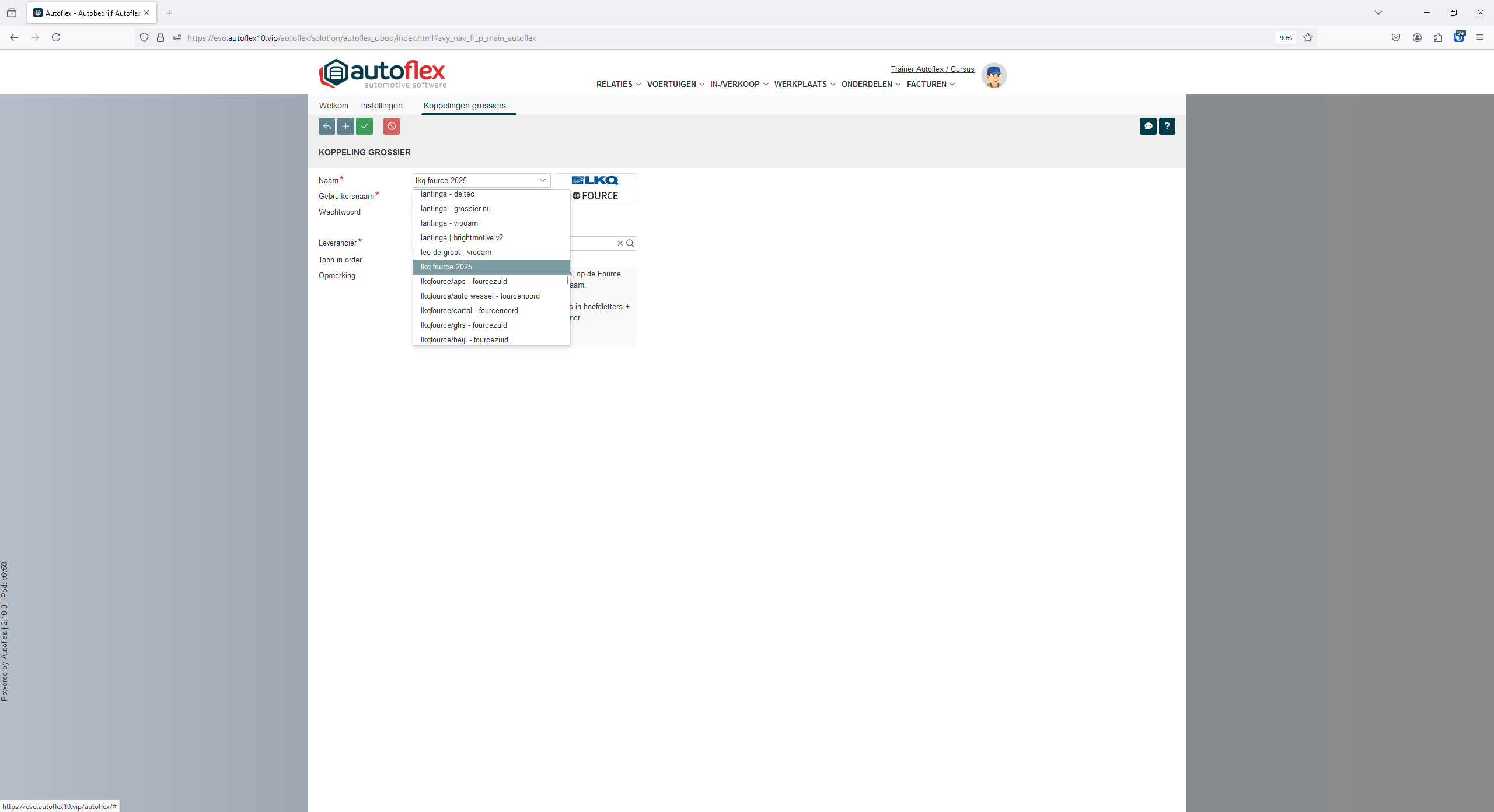 Alle LKQ Fource koppelingen worden vanaf November 2024 samengevoegd naar één koppeling. Jij als garagist krijgt hier een nieuw debiteurnummer en wellicht nieuw inlog en wachtwoord voor. In onderstaande handleiding laten we zien hoe jij zelf de koppeling aanpast in Autoflex.