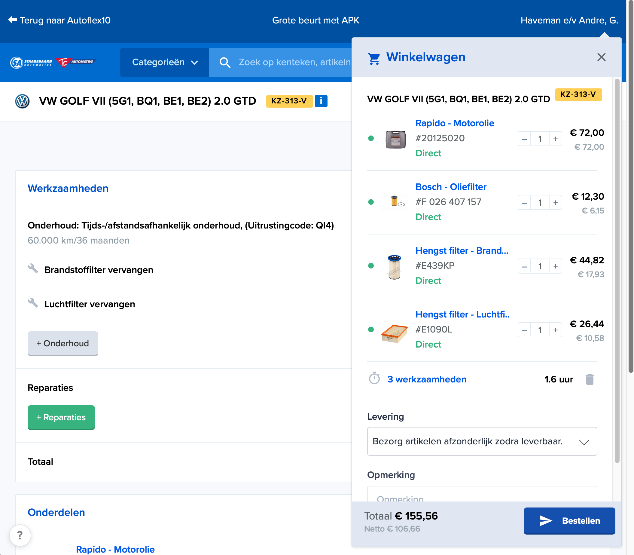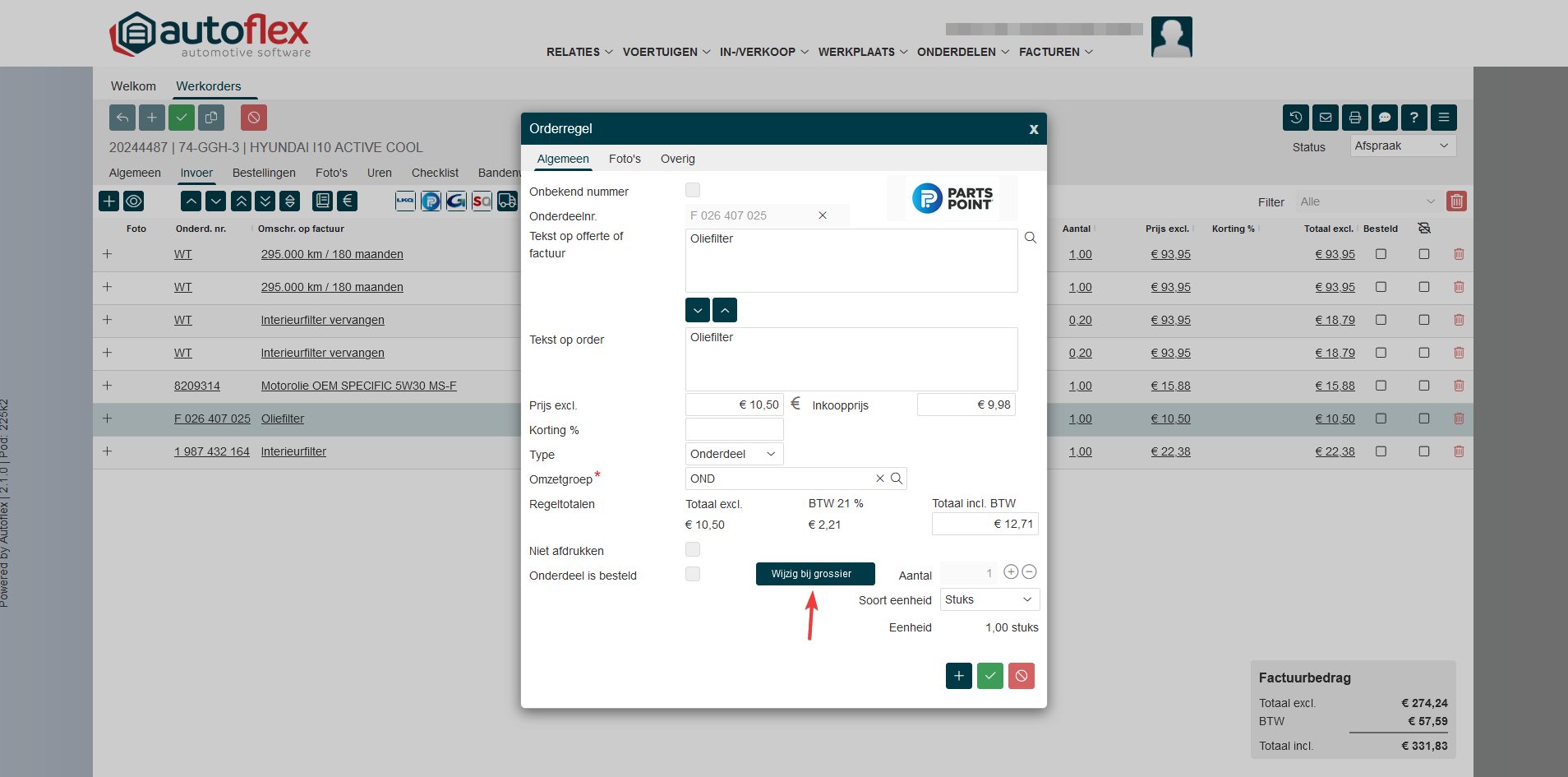 Klik in de werkorder op de grossierskoppeling en voeg alle onderdelen en werktijden toe zoals je gewend bent in het grossiersportaal.