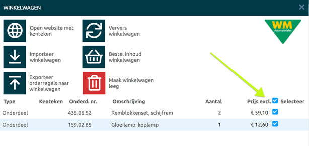 2. Alle onderdelen uit de winkelwagen zullen nu getoond worden, maak een selectie van de onderdelen die op deze order moeten komen