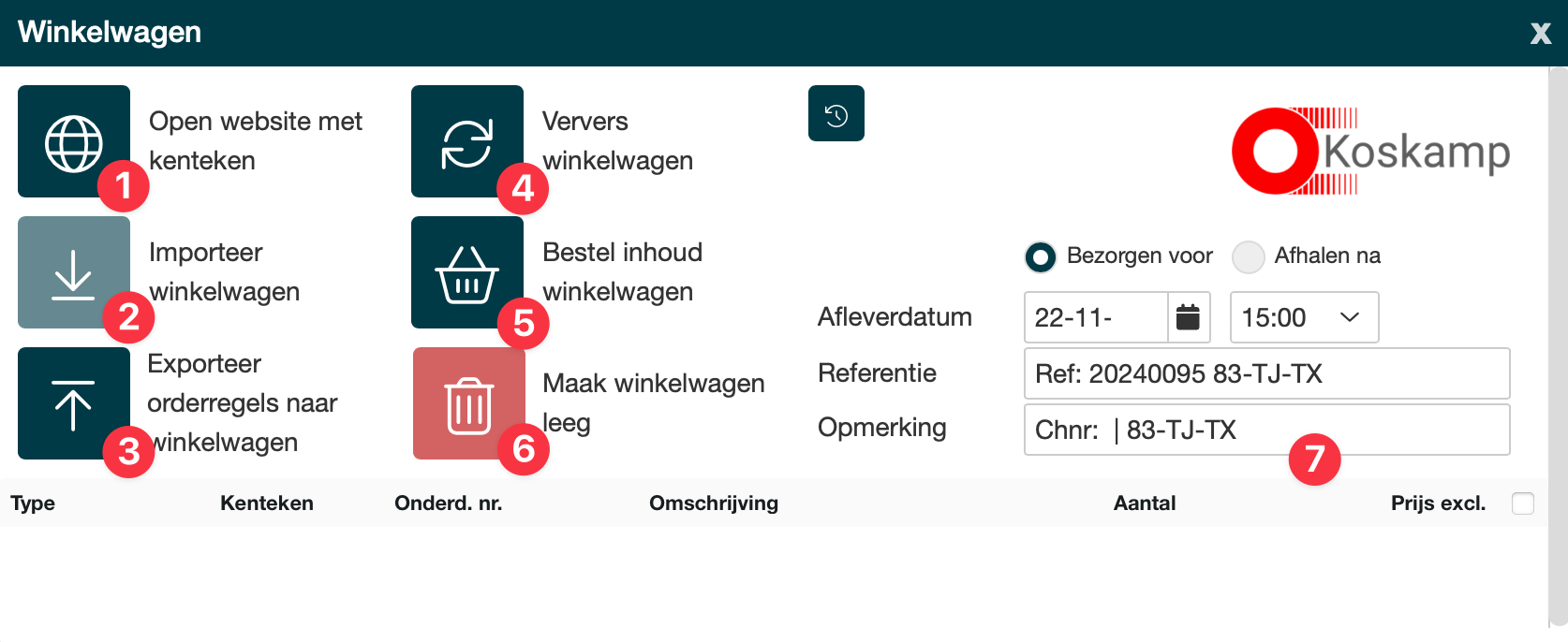 Grossierskoppeling Koskamp in de werkorder Na het klikken op het Koskamp logo zie je de mogelijkheden van de ze koppeling |