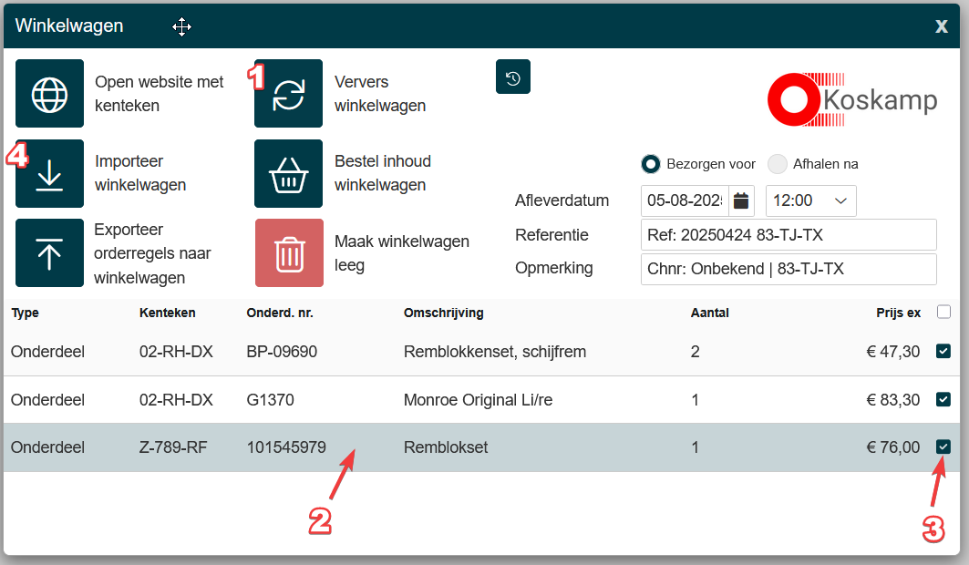 In de tab bestellingen zie je alle bestellingen van deze order, bij de Koskamp order zie je ook de verwachte levering en het aantal beschikbaar voor dit onderdeelnummer. |
