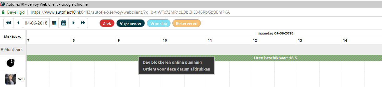 De afspraak kan je koppelen aan een monteur en inplannen door de afspraak te slepen naar 1 van de monteurs.