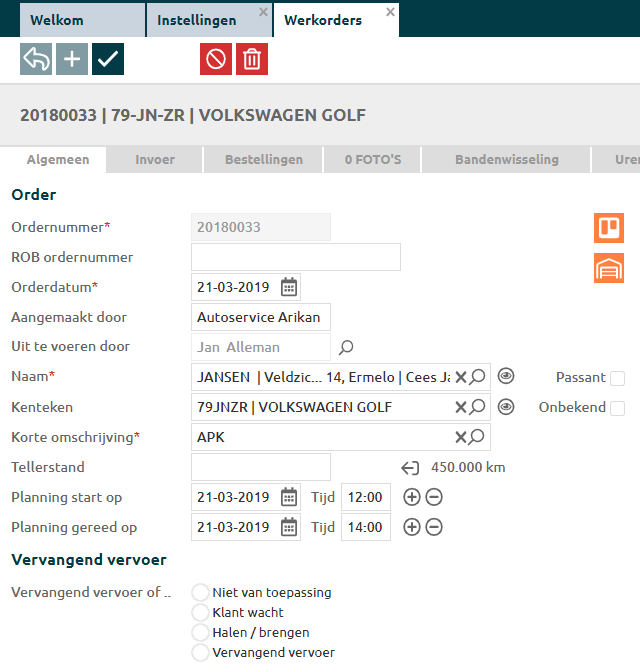 Zodra je de afspraak hebt gesleept naar een monteur, opent het werkorder scherm met de betreffende afspraak. Hier moet je de afspraak nog wel opslaan zodat deze definitief in de planning komt.
