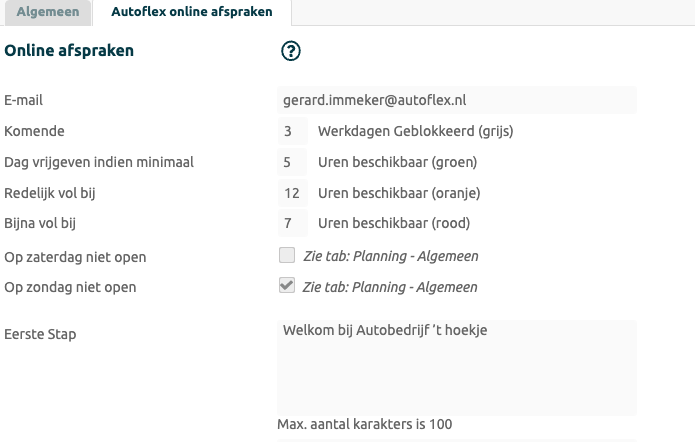 | Zaterdag niet beschikbaar | Zet hier een vinkje als je wilt dat zaterdag standaard niet zichtbaar is in de online planning |