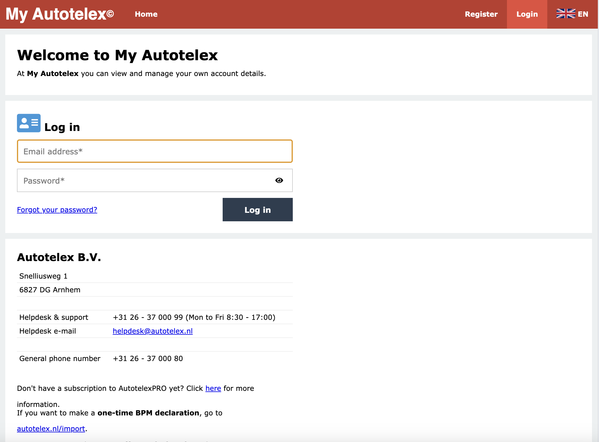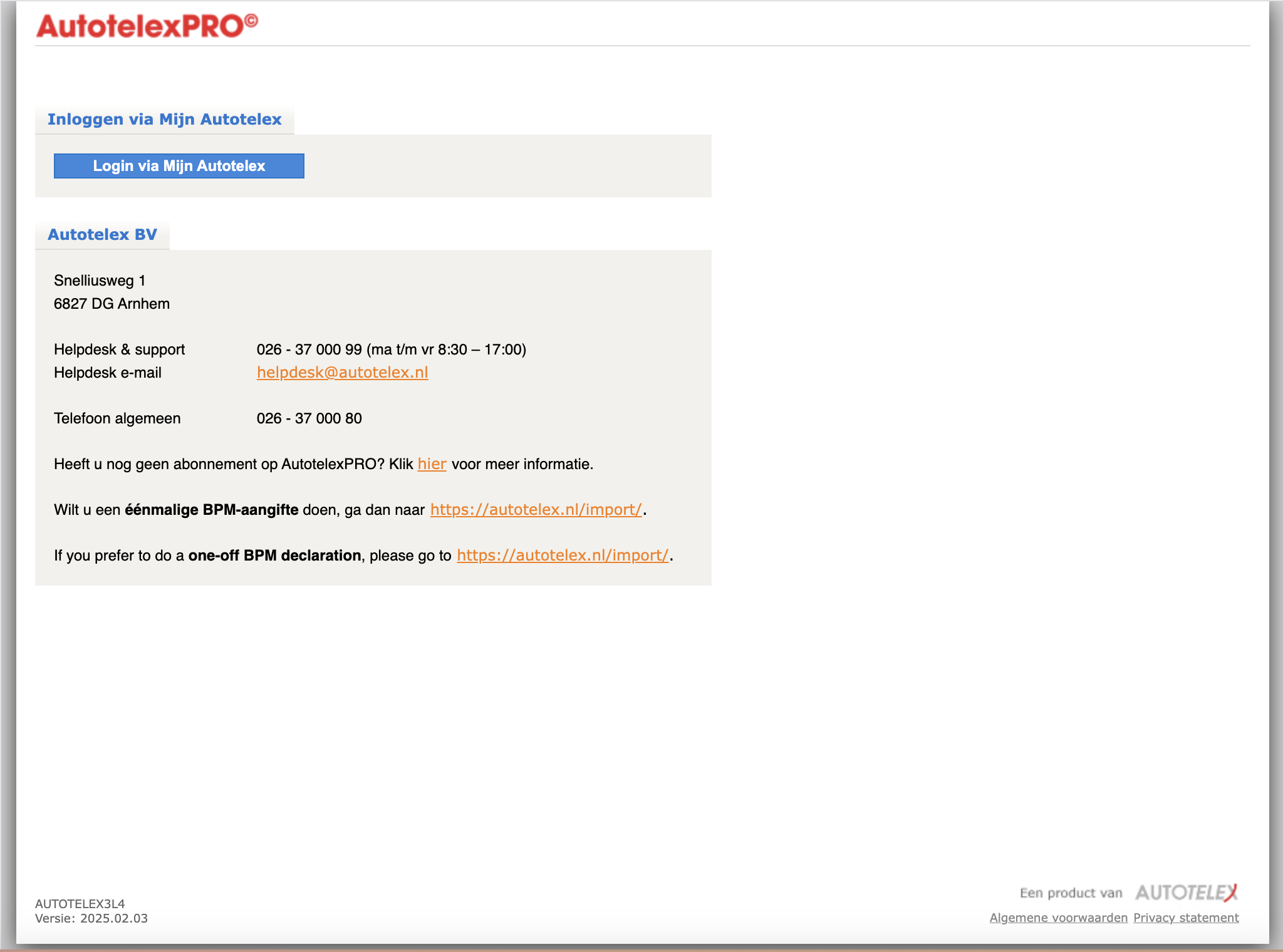 Klik op de knop Autotelex Portal, het Portaal opent in een nieuw browser scherm |