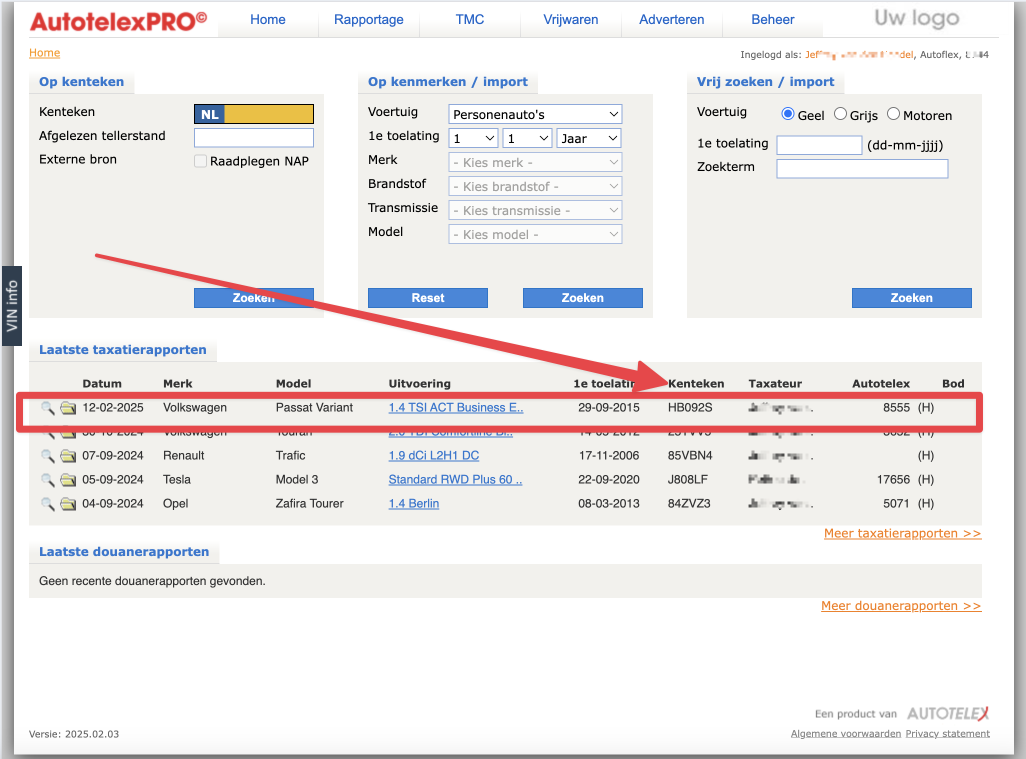In het portaal van AutotelexPRO zien we een volkswagen staan met kenteken HB092S, deze is geinventariseerd en ingevoerd via de APP op de parkeerplaats toen de inkoper een rondje rond de auto maakte. |
