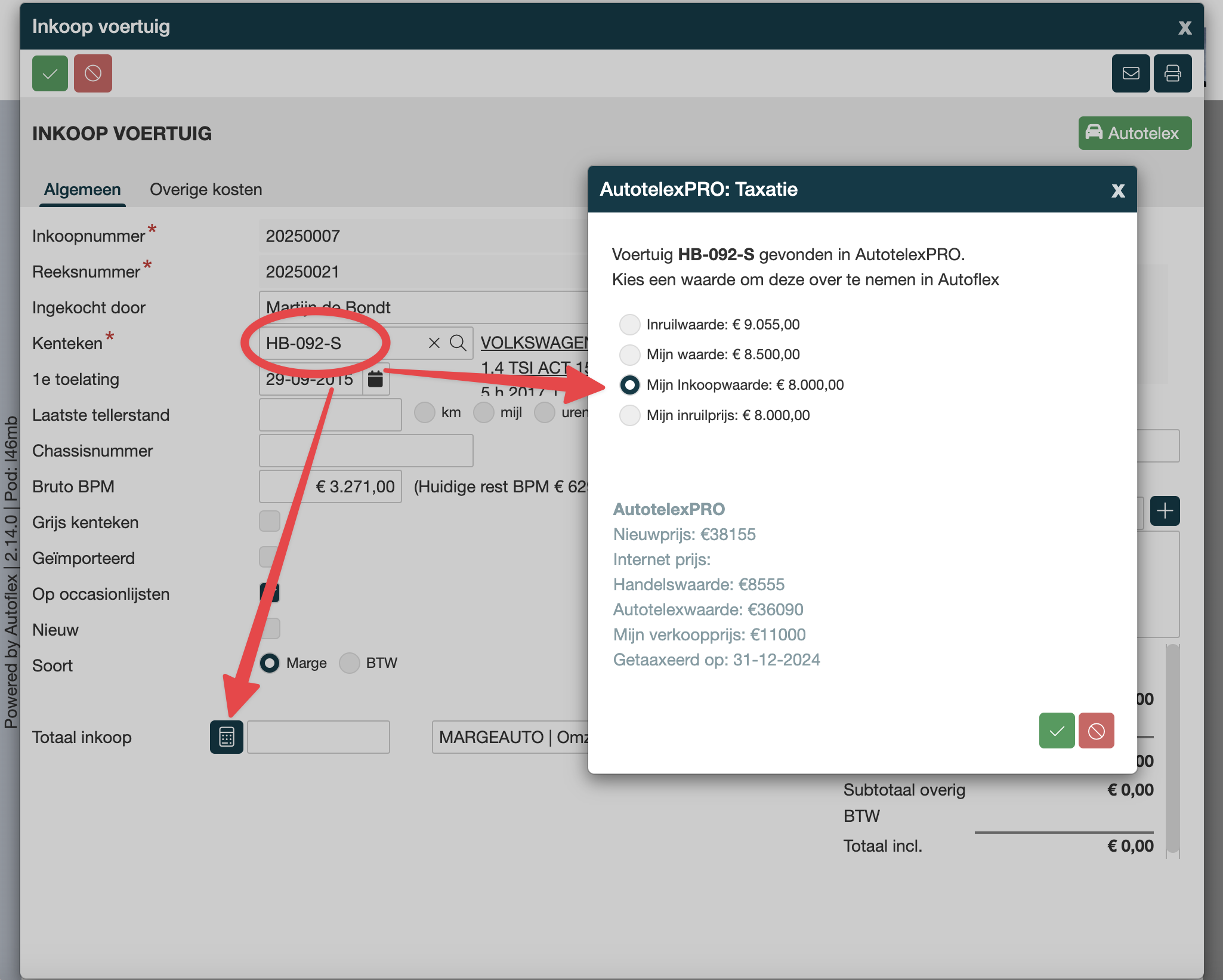 Omdat we in de inkoop voertuig het kenteken hebben opgegeven, worden nu de waarden uit AutotelexPRO getoond en kunnen nu worden gebruikt voor de inkoop prijs. |